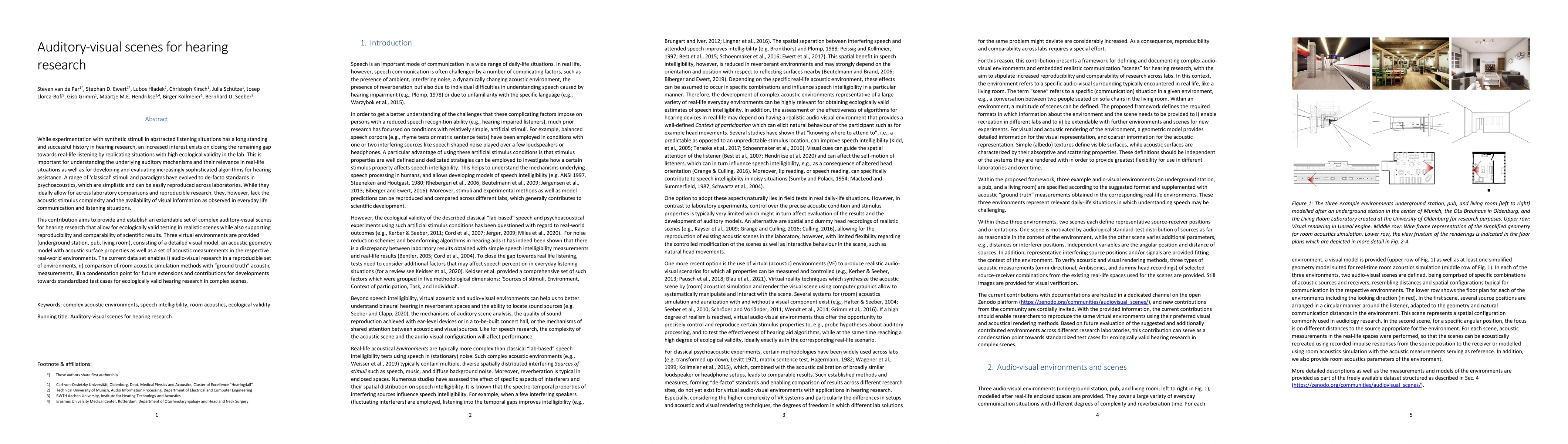 While experimentation with synthetic stimuli in abstracted listening situations has a long standing and successful history in hearing research, an increased interest exists on closing the remaining gap towards real-life listening by replicating situations with high ecological validity in the lab. This is important for understanding the underlying auditory mechanisms and their relevance in real-life situations as well as for developing and evaluating increasingly sophisticated algorithms for hearing assistance. A range of 'classical' stimuli and paradigms have evolved to de-facto standards in psychoacoustics, which are simplistic and can be easily reproduced across laboratories. While they ideally allow for across laboratory comparisons and reproducible research, they, however, lack the acoustic stimulus complexity and the availability of visual information as observed in everyday life communication and listening situations. This contribution aims to provide and establish an extendable set of complex auditory-visual scenes for hearing research that allow for ecologically valid testing in realistic scenes while also supporting reproducibility and comparability of scientific results. Three virtual environments are provided (underground station, pub, living room), consisting of a detailed visual model, an acoustic geometry model with acoustic surface properties as well as a set of acoustic measurements in the respective real-world environments. The current data set enables i) audio-visual research in a reproducible set of environments, ii) comparison of room acoustic simulation methods with "ground truth" acoustic measurements, iii) a condensation point for future extensions and contributions for developments towards standardized test cases for ecologically valid hearing research in complex scenes.