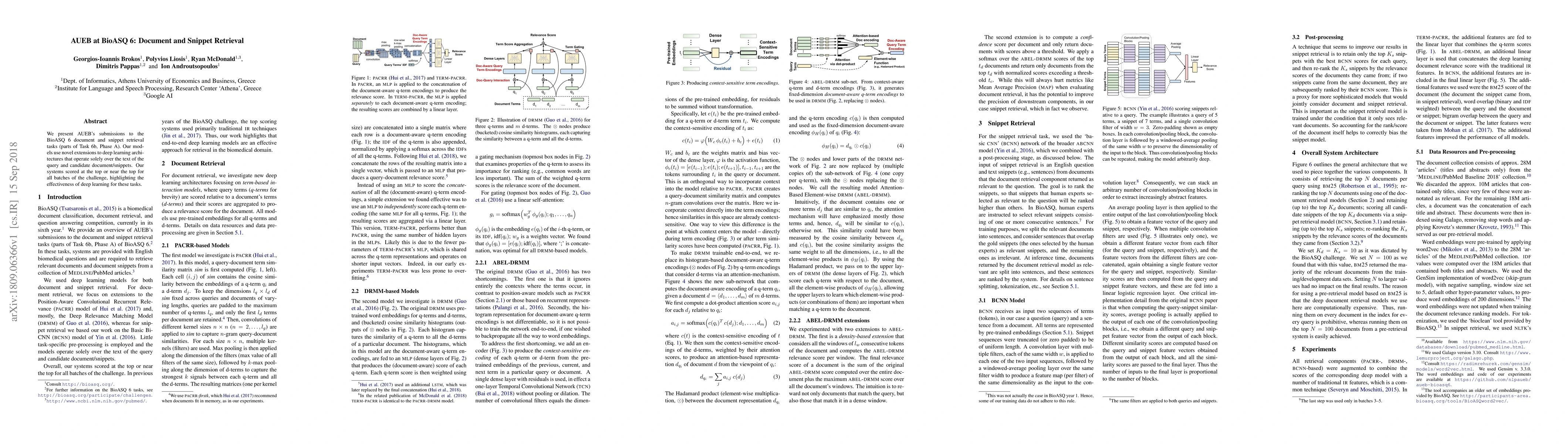 AUEB's submissions to BioASQ 6 document and snippet retrieval tasks utilize novel deep learning extensions, achieving top scores by processing only query and candidate text. The results underscore the efficacy of deep learning in these retrieval challenges.
