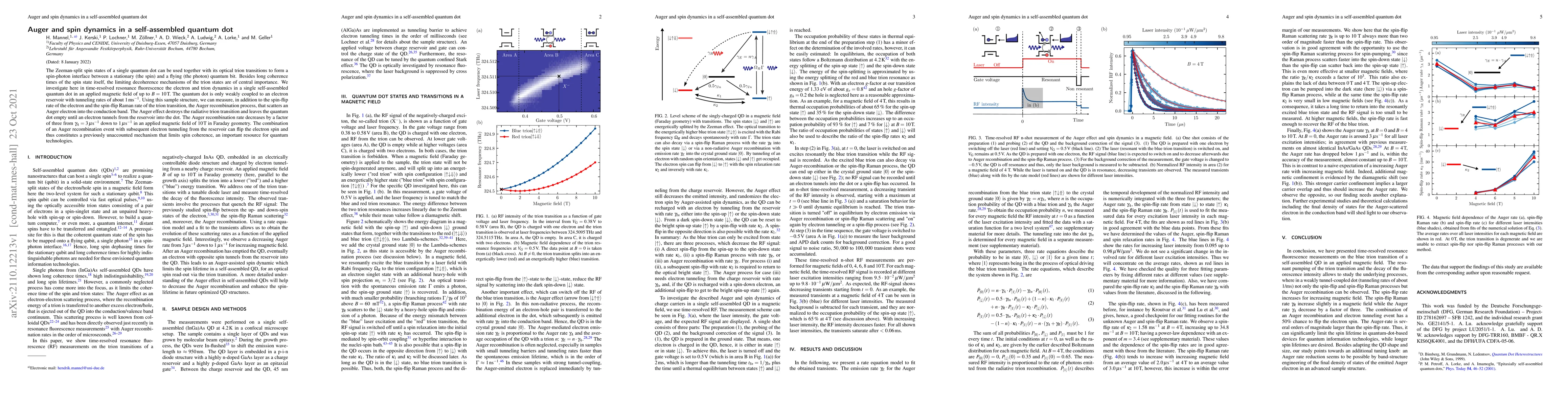 The Zeeman-split spin states of a single quantum dot can be used together with its optical trion transitions to form a spin-photon interface between a stationary (the spin) and a flying (the photon) quantum bit. Besides long coherence times of the spin state itself, the limiting decoherence mechanisms of the trion states are of central importance. We investigate here in time-resolved resonance fluorescence the electron and trion dynamics in a single self-assembled quantum dot in an applied magnetic field of up to $B = 10\,$T. The quantum dot is only weakly coupled to an electron reservoir with tunneling rates of about $1\,$ms$^{-1}$. Using this sample structure, we can measure, in addition to the spin-flip rate of the electron and the spin-flip Raman rate of the trion transition, the Auger recombination process, that scatters an Auger electron into the conduction band. The Auger effect destroys the radiative trion transition and leaves the quantum dot empty until an electron tunnels from the reservoir into the dot. The Auger recombination rate decreases by a factor of three from $\gamma_A=3\,\mu$s$^{-1}$ down to $1\,\mu$s$^{-1}$ in an applied magnetic field of $10\,$T in Faraday geometry. The combination of an Auger recombination event with subsequent electron tunneling from the reservoir can flip the electron spin and thus constitutes a previously unaccounted mechanism that limits spin coherence, an important resource for quantum technologies.