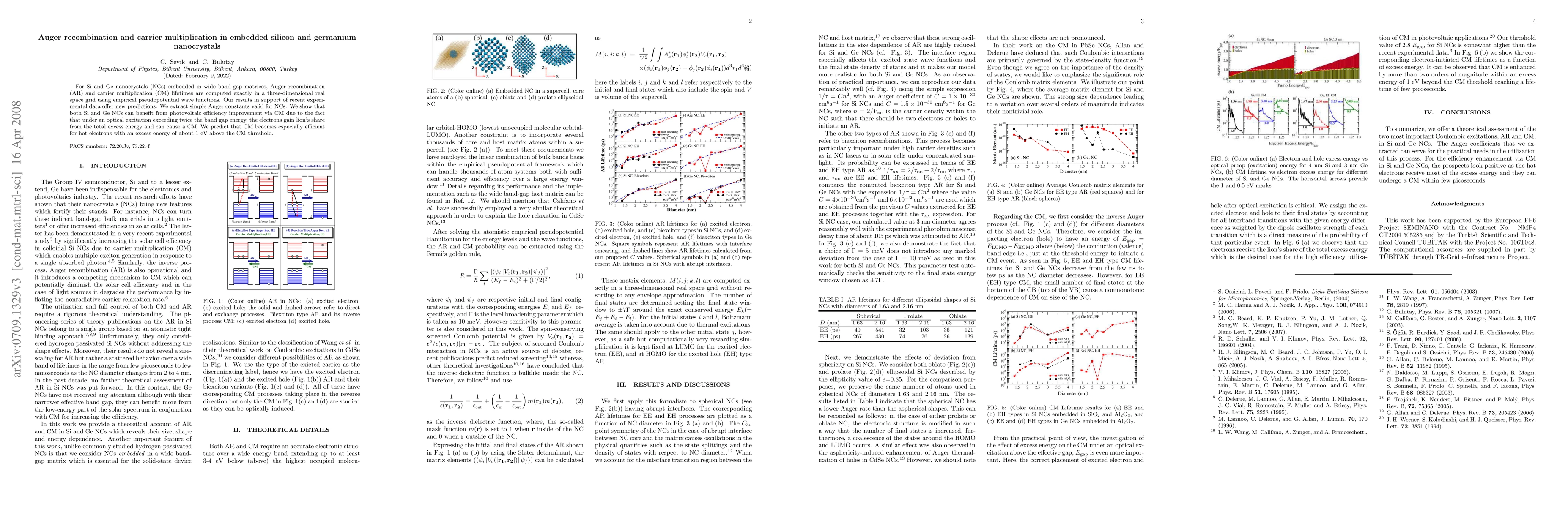 This paper computes Auger recombination and carrier multiplication lifetimes in Si and Ge nanocrystals using empirical pseudopotential wave functions, providing new predictions that support recent experimental data. It finds that both materials can enhance photovoltaic efficiency through carrier multiplication when optical excitation exceeds twice the band gap energy, especially for hot electrons with excess energy around 1 eV above the threshold.