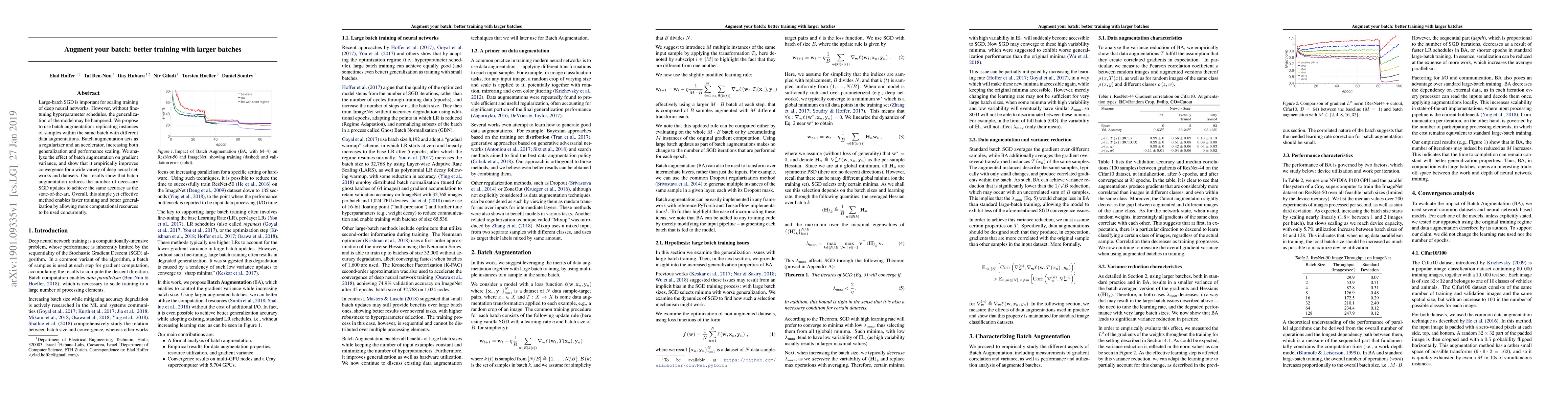 Large-batch SGD is important for scaling training of deep neural networks. However, without fine-tuning hyperparameter schedules, the generalization of the model may be hampered. We propose to use batch augmentation: replicating instances of samples within the same batch with different data augmentations. Batch augmentation acts as a regularizer and an accelerator, increasing both generalization and performance scaling. We analyze the effect of batch augmentation on gradient variance and show that it empirically improves convergence for a wide variety of deep neural networks and datasets. Our results show that batch augmentation reduces the number of necessary SGD updates to achieve the same accuracy as the state-of-the-art. Overall, this simple yet effective method enables faster training and better generalization by allowing more computational resources to be used concurrently.