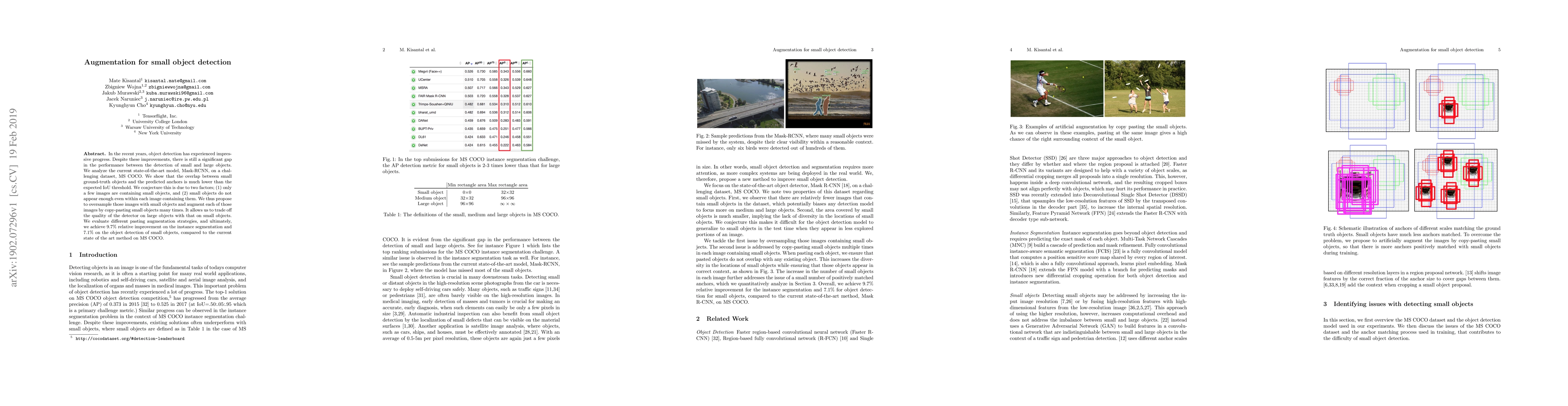 In recent years, object detection has experienced impressive progress. Despite these improvements, there is still a significant gap in the performance between the detection of small and large objects. We analyze the current state-of-the-art model, Mask-RCNN, on a challenging dataset, MS COCO. We show that the overlap between small ground-truth objects and the predicted anchors is much lower than the expected IoU threshold. We conjecture this is due to two factors; (1) only a few images are containing small objects, and (2) small objects do not appear enough even within each image containing them. We thus propose to oversample those images with small objects and augment each of those images by copy-pasting small objects many times. It allows us to trade off the quality of the detector on large objects with that on small objects. We evaluate different pasting augmentation strategies, and ultimately, we achieve 9.7\% relative improvement on the instance segmentation and 7.1\% on the object detection of small objects, compared to the current state of the art method on MS COCO.