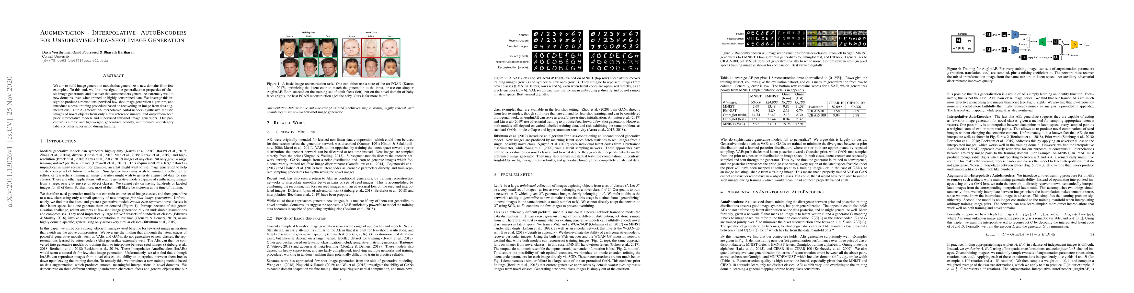 This paper introduces Augmentation-Interpolative AutoEncoders for generating images from few examples, leveraging the strong generalization of autoencoders. The proposed method synthesizes realistic novel object images using only a few reference images, outperforming prior models and requiring no supervision during training.