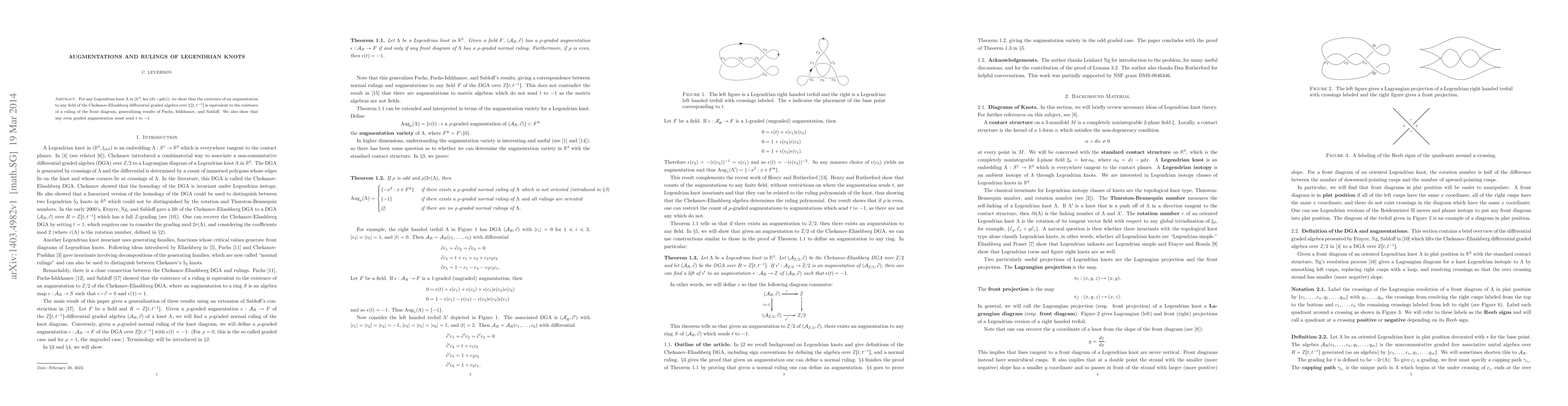 Two-line summary: This paper establishes an equivalence between augmentations of the Chekanov-Eliashberg algebra of Legendrian knots in (R^3,ker(dz-ydx)) and the existence of a ruling in their front diagrams, extending previous results. It further proves that any even graded augmentation must map the generator t to -1.