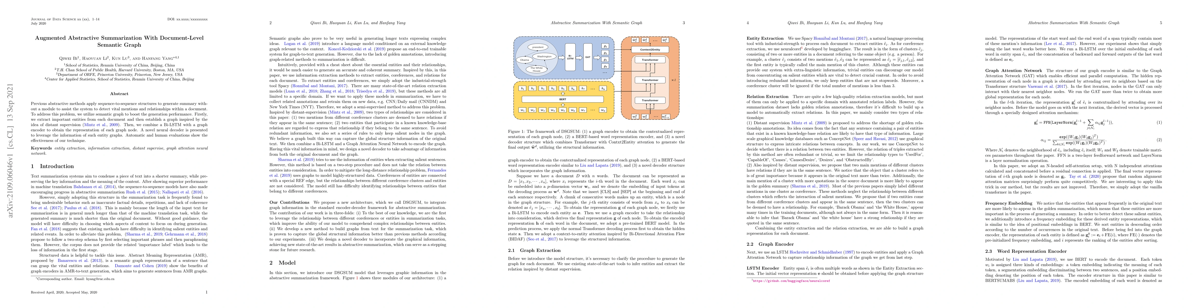 Previous abstractive methods apply sequence-to-sequence structures to generate summary without a module to assist the system to detect vital mentions and relationships within a document. To address this problem, we utilize semantic graph to boost the generation performance. Firstly, we extract important entities from each document and then establish a graph inspired by the idea of distant supervision \citep{mintz-etal-2009-distant}. Then, we combine a Bi-LSTM with a graph encoder to obtain the representation of each graph node. A novel neural decoder is presented to leverage the information of such entity graphs. Automatic and human evaluations show the effectiveness of our technique.