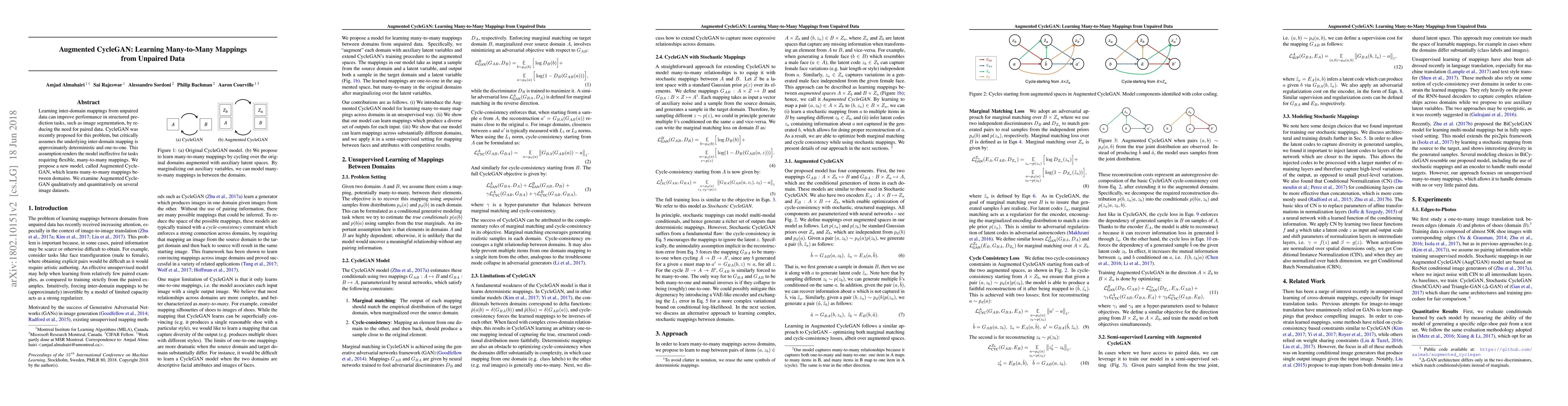 Learning inter-domain mappings from unpaired data can improve performance in structured prediction tasks, such as image segmentation, by reducing the need for paired data. CycleGAN was recently proposed for this problem, but critically assumes the underlying inter-domain mapping is approximately deterministic and one-to-one. This assumption renders the model ineffective for tasks requiring flexible, many-to-many mappings. We propose a new model, called Augmented CycleGAN, which learns many-to-many mappings between domains. We examine Augmented CycleGAN qualitatively and quantitatively on several image datasets.