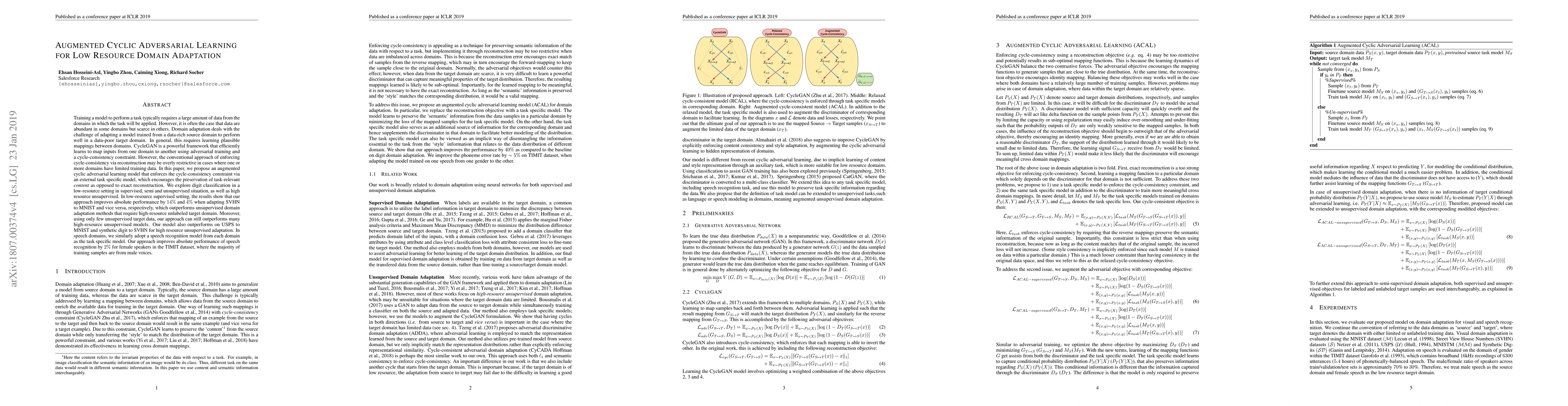 Training a model to perform a task typically requires a large amount of data from the domains in which the task will be applied. However, it is often the case that data are abundant in some domains but scarce in others. Domain adaptation deals with the challenge of adapting a model trained from a data-rich source domain to perform well in a data-poor target domain. In general, this requires learning plausible mappings between domains. CycleGAN is a powerful framework that efficiently learns to map inputs from one domain to another using adversarial training and a cycle-consistency constraint. However, the conventional approach of enforcing cycle-consistency via reconstruction may be overly restrictive in cases where one or more domains have limited training data. In this paper, we propose an augmented cyclic adversarial learning model that enforces the cycle-consistency constraint via an external task specific model, which encourages the preservation of task-relevant content as opposed to exact reconstruction. We explore digit classification in a low-resource setting in supervised, semi and unsupervised situation, as well as high resource unsupervised. In low-resource supervised setting, the results show that our approach improves absolute performance by 14% and 4% when adapting SVHN to MNIST and vice versa, respectively, which outperforms unsupervised domain adaptation methods that require high-resource unlabeled target domain. Moreover, using only few unsupervised target data, our approach can still outperforms many high-resource unsupervised models. In speech domains, we similarly adopt a speech recognition model from each domain as the task specific model. Our approach improves absolute performance of speech recognition by 2% for female speakers in the TIMIT dataset, where the majority of training samples are from male voices.