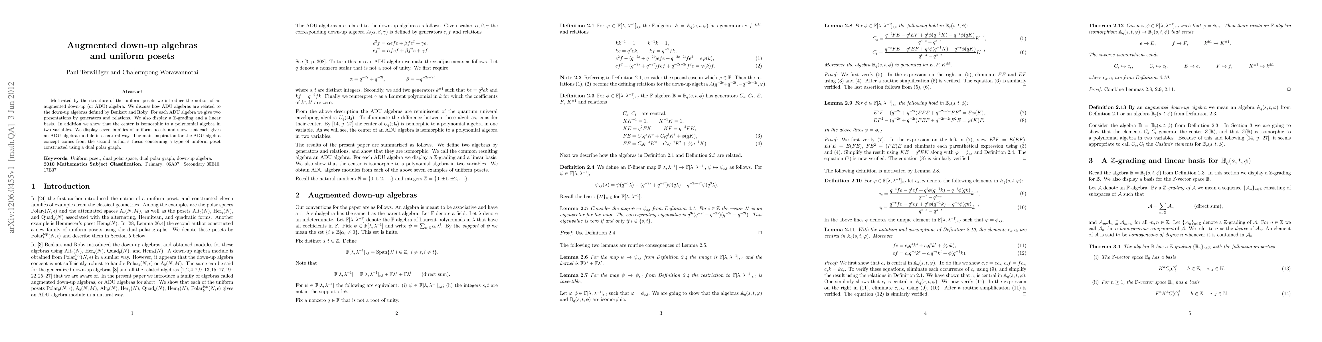 The paper's main technical contribution is the definition and detailed study of augmented down-up algebras, including their presentations, Z-grading, linear basis, and the isomorphism of their centers to polynomial algebras in two variables.
