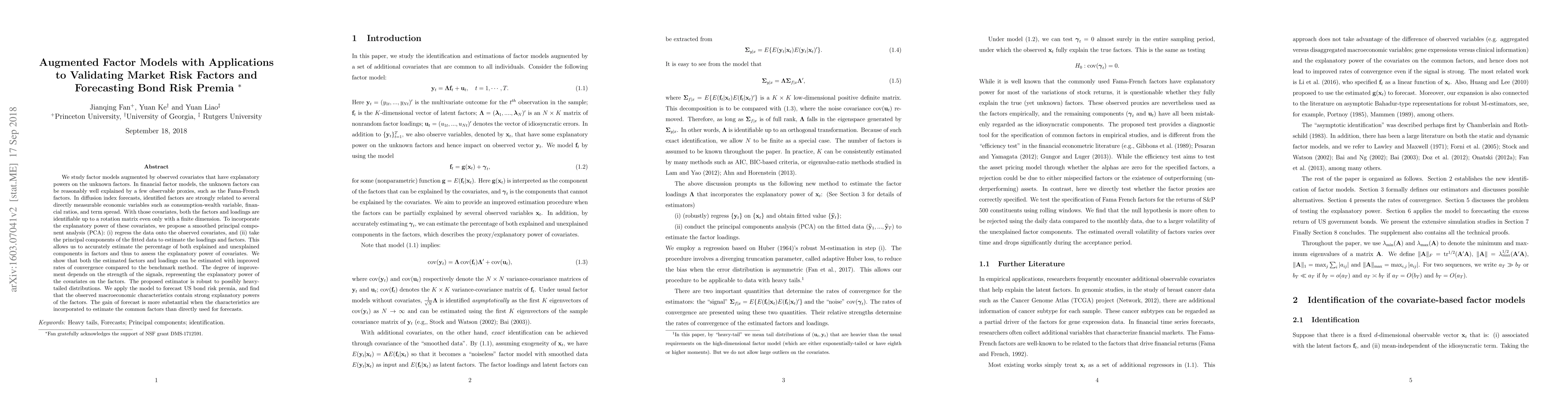 This paper proposes an augmented factor model incorporating observed covariates to improve the estimation of financial factors and their loadings. The authors utilize smoothed PCA to estimate factors and loadings, demonstrating improved convergence rates and robustness. The model is applied to forecast US bond risk premia, showing significant gains from incorporating macroeconomic characteristics.
