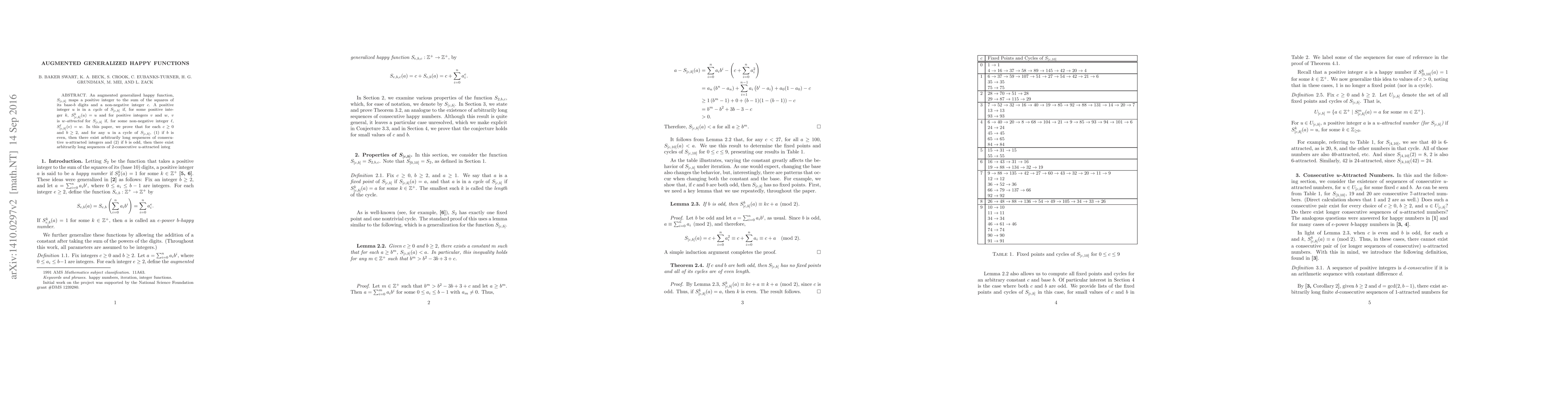 This paper explores augmented generalized happy functions, specifically mapping positive integers to the sum of squares of their base-$b$ digits plus a non-negative integer $c$. It proves that for even bases, long sequences of consecutive $u$-attracted integers exist, while for odd bases, long sequences of 2-consecutive $u$-attracted integers exist.