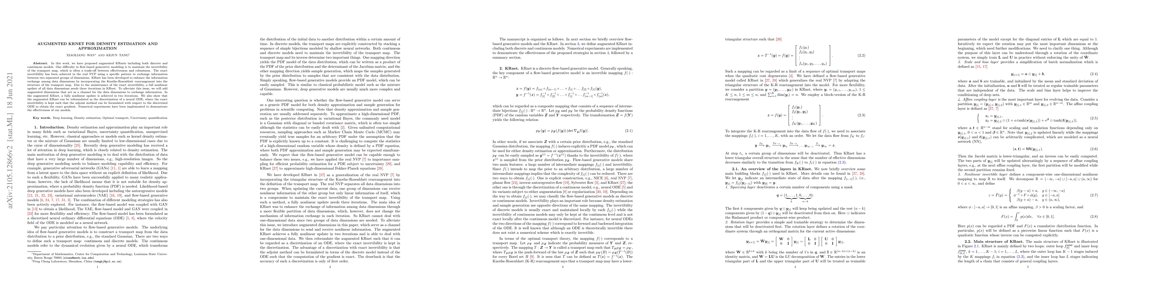 This paper proposes augmented KRnets for density estimation and approximation, enhancing information exchange among data dimensions through augmented dimensions. The model achieves exact invertibility in two iterations, reformulating as a discretized neural ODE to maintain exact gradient computation, and demonstrates effectiveness through numerical experiments.