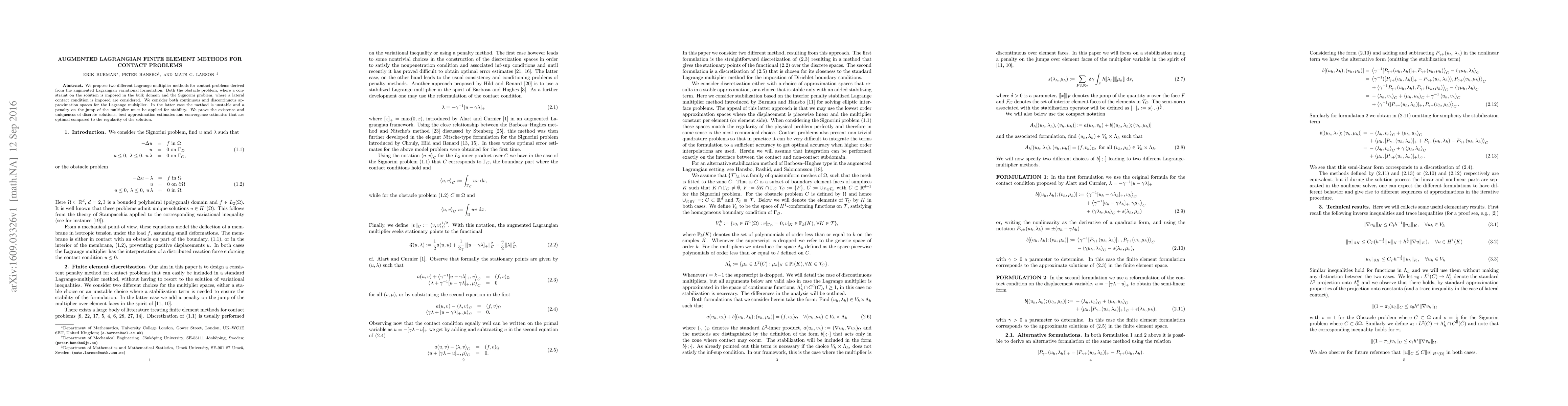 Researchers propose two methods for solving contact problems using augmented Lagrangian finite element methods, demonstrating existence and uniqueness of discrete solutions with optimal convergence estimates.
