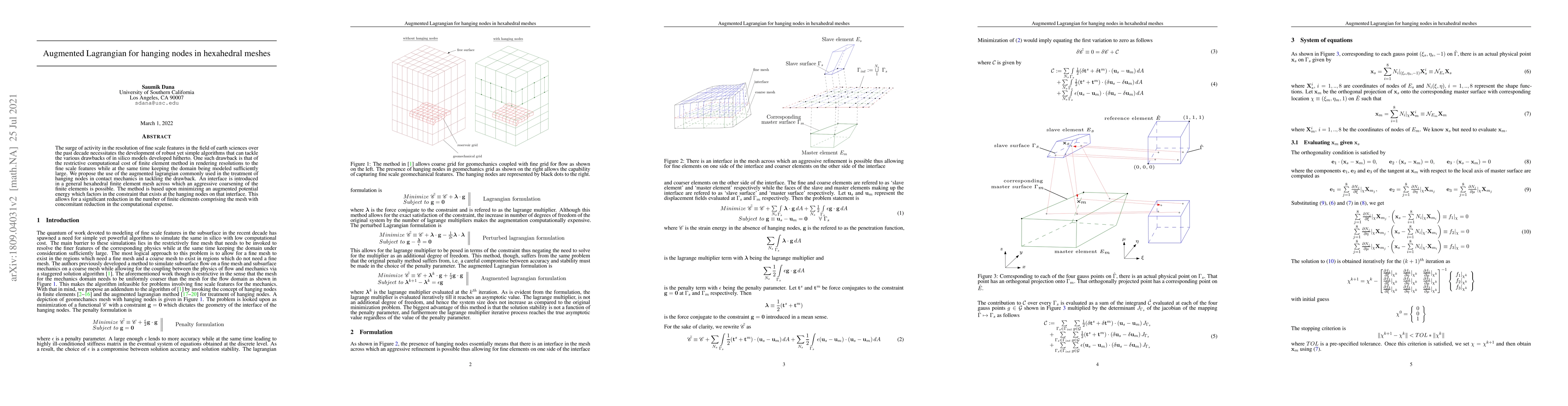 This paper proposes using the augmented Lagrangian method to address hanging nodes in hexahedral mesh finite element models, aiming to reduce computational costs while maintaining resolution for fine scale features in earth sciences. The method introduces an interface for coarsening elements, minimizing augmented potential energy to balance constraints at hanging nodes.