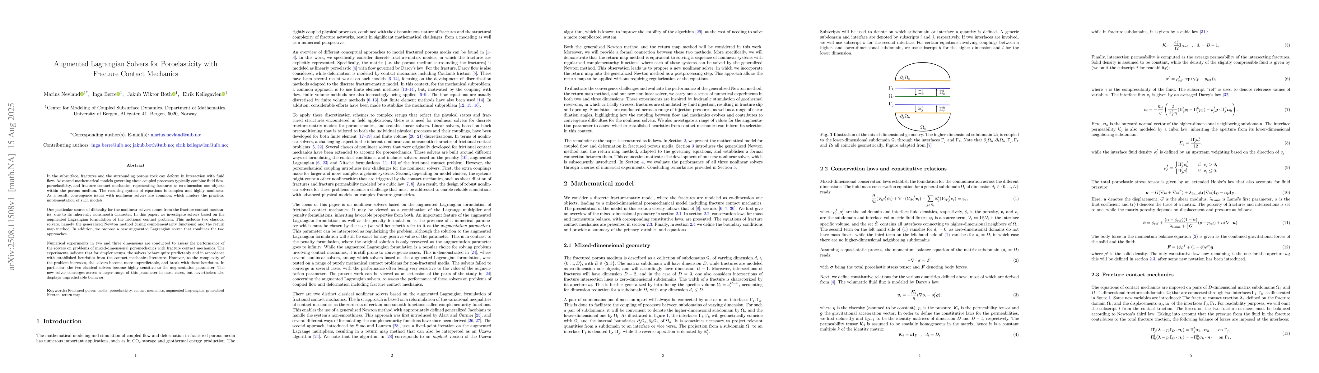 In the subsurface, fractures and the surrounding porous rock can deform in interaction with fluid flow. Advanced mathematical models governing these coupled processes typically combine fluid flow, poroelasticity, and fracture contact mechanics, representing fractures as co-dimension one objects within the porous medium. The resulting system of equations is complex and highly nonlinear. As a result, convergence issues with nonlinear solvers are common, which hinders the practical implementation of such models. One particular source of difficulty for the nonlinear solvers comes from the fracture contact mechanics, due to its inherently nonsmooth character. In this paper, we investigate solvers based on the augmented Lagrangian formulation of the frictional contact problem. This includes two classical solvers, namely the generalized Newton method (using complementarity functions) and the return map method. In addition, we propose a new augmented Lagrangian solver that combines the two approaches. Numerical experiments in two and three dimensions are conducted to assess the performance of the solvers on problems of mixed-dimensional poromechanics with fracture contact mechanics. The experiments indicate that for simpler setups, the solvers behave quite predictably and in accordance with established heuristics from the contact mechanics literature. However, as the complexity of the problem increases, the solvers become more unpredictable, and break with these heuristics. In particular, the two classical solvers become highly sensitive to the augmentation parameter. The new solver converges across a larger range of this parameter in most cases, but nevertheless also displays unpredictable behavior.
