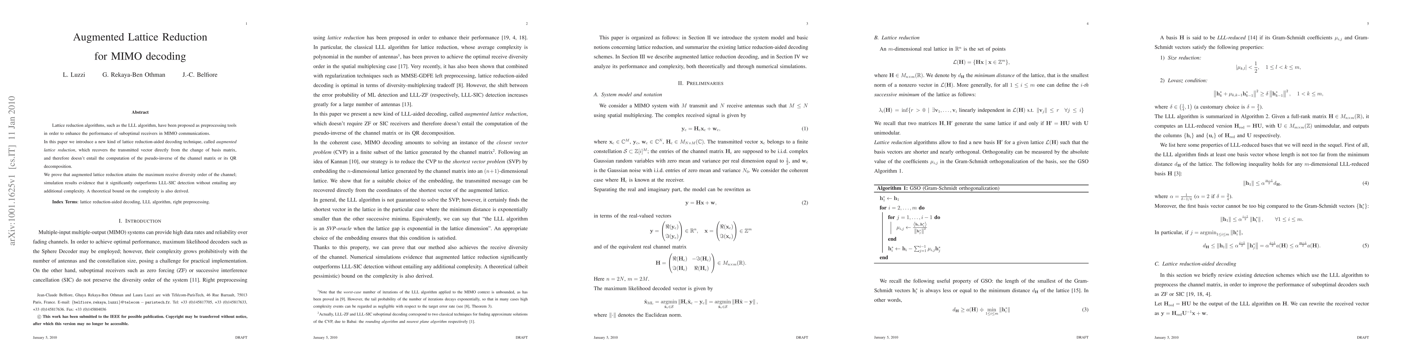 This paper introduces augmented lattice reduction for MIMO decoding, a technique that directly recovers the transmitted vector without computing the pseudo-inverse or QR decomposition of the channel matrix. It achieves maximum receive diversity and outperforms LLL-SIC detection with no additional complexity.