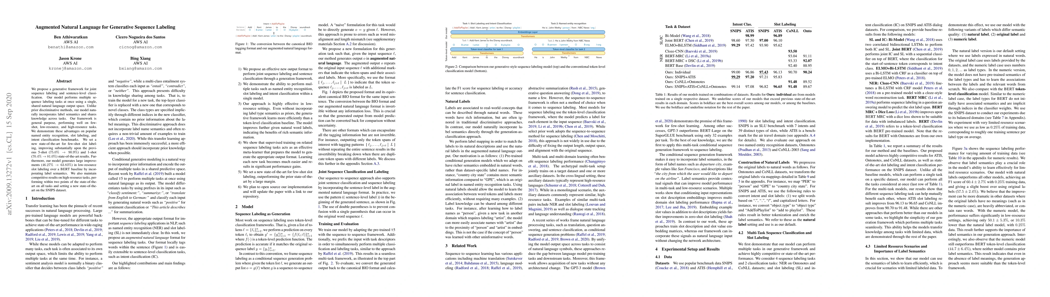 We propose a generative framework for joint sequence labeling and sentence-level classification. Our model performs multiple sequence labeling tasks at once using a single, shared natural language output space. Unlike prior discriminative methods, our model naturally incorporates label semantics and shares knowledge across tasks. Our framework is general purpose, performing well on few-shot, low-resource, and high-resource tasks. We demonstrate these advantages on popular named entity recognition, slot labeling, and intent classification benchmarks. We set a new state-of-the-art for few-shot slot labeling, improving substantially upon the previous 5-shot ($75.0\% \rightarrow 90.9\%$) and 1-shot ($70.4\% \rightarrow 81.0\%$) state-of-the-art results. Furthermore, our model generates large improvements ($46.27\% \rightarrow 63.83\%$) in low-resource slot labeling over a BERT baseline by incorporating label semantics. We also maintain competitive results on high-resource tasks, performing within two points of the state-of-the-art on all tasks and setting a new state-of-the-art on the SNIPS dataset.