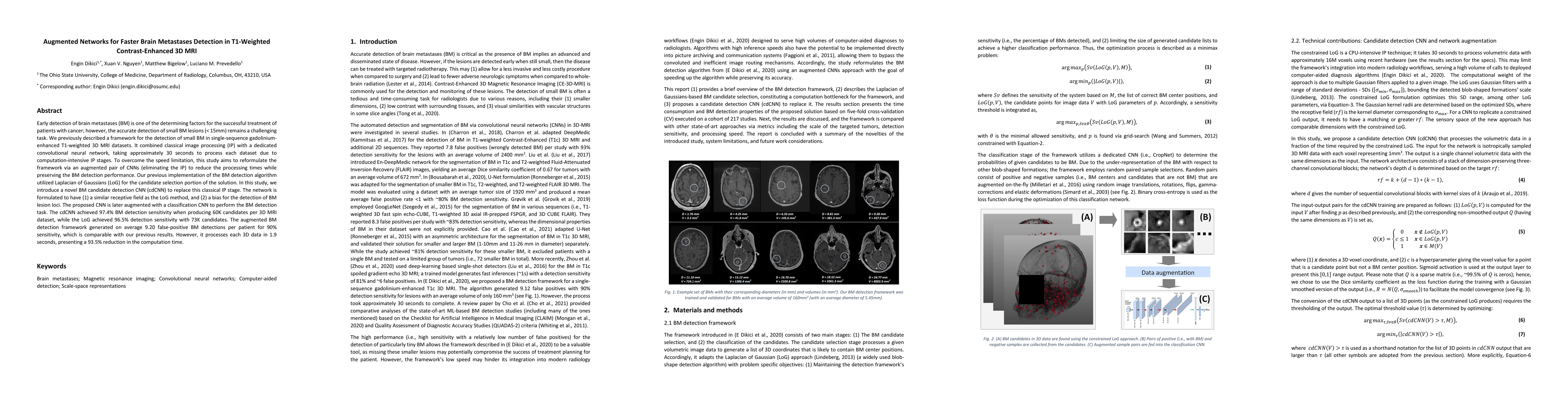 This study reformulates a brain metastases detection framework using an augmented pair of convolutional neural networks (CNNs) to replace classical image processing, achieving a 93.5% reduction in processing time from 30 seconds to 1.9 seconds while maintaining high detection sensitivity (97.4% with 60K candidates).