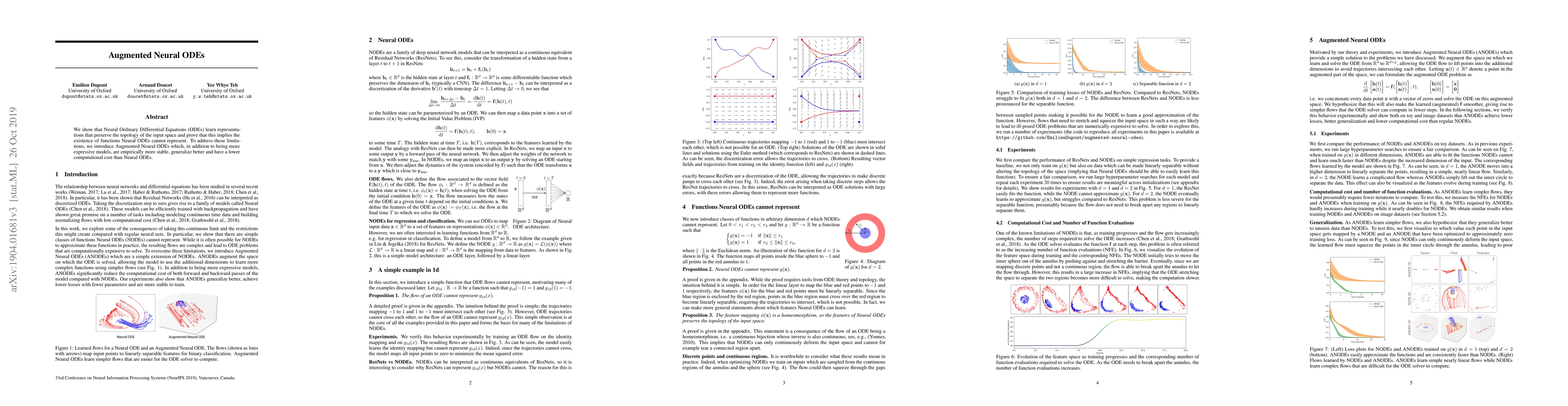 Summary: Neural ODEs preserve input space topology but have representation limitations; Augmented Neural ODEs improve expressiveness, stability, generalization, and computational efficiency.