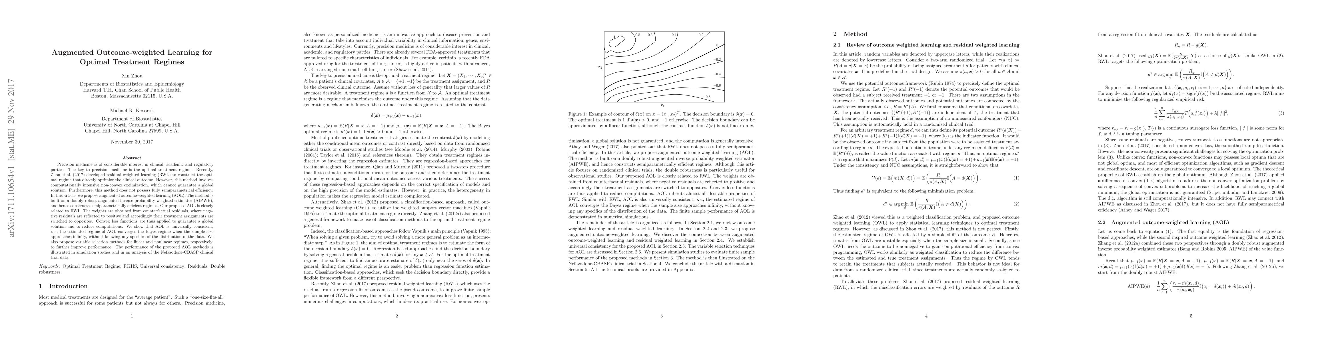 This paper proposes augmented outcome-weighted learning (AOL) to construct optimal treatment regimes in precision medicine, addressing the limitations of residual weighted learning (RWL) by using convex optimization and doubly robust estimators for semiparametric efficiency and global solutions. The method is shown to be universally consistent and is demonstrated through simulations and a clinical trial analysis.
