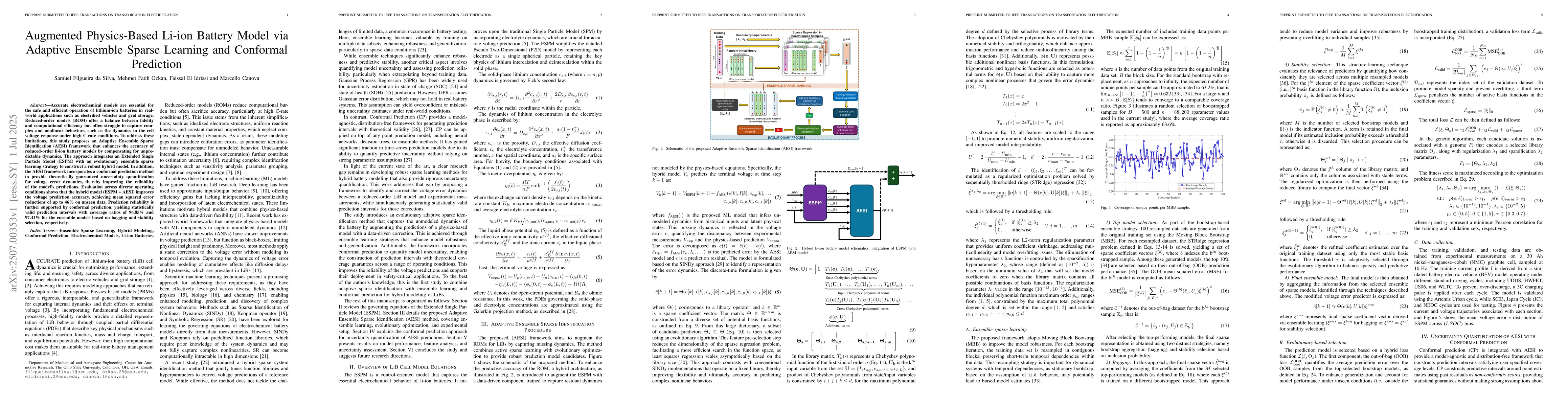 Accurate electrochemical models are essential for the safe and efficient operation of lithium-ion batteries in real-world applications such as electrified vehicles and grid storage. Reduced-order models (ROM) offer a balance between fidelity and computational efficiency but often struggle to capture complex and nonlinear behaviors, such as the dynamics in the cell voltage response under high C-rate conditions. To address these limitations, this study proposes an Adaptive Ensemble Sparse Identification (AESI) framework that enhances the accuracy of reduced-order li-ion battery models by compensating for unpredictable dynamics. The approach integrates an Extended Single Particle Model (ESPM) with an evolutionary ensemble sparse learning strategy to construct a robust hybrid model. In addition, the AESI framework incorporates a conformal prediction method to provide theoretically guaranteed uncertainty quantification for voltage error dynamics, thereby improving the reliability of the model's predictions. Evaluation across diverse operating conditions shows that the hybrid model (ESPM + AESI) improves the voltage prediction accuracy, achieving mean squared error reductions of up to 46% on unseen data. Prediction reliability is further supported by conformal prediction, yielding statistically valid prediction intervals with coverage ratios of 96.85% and 97.41% for the ensemble models based on bagging and stability selection, respectively.