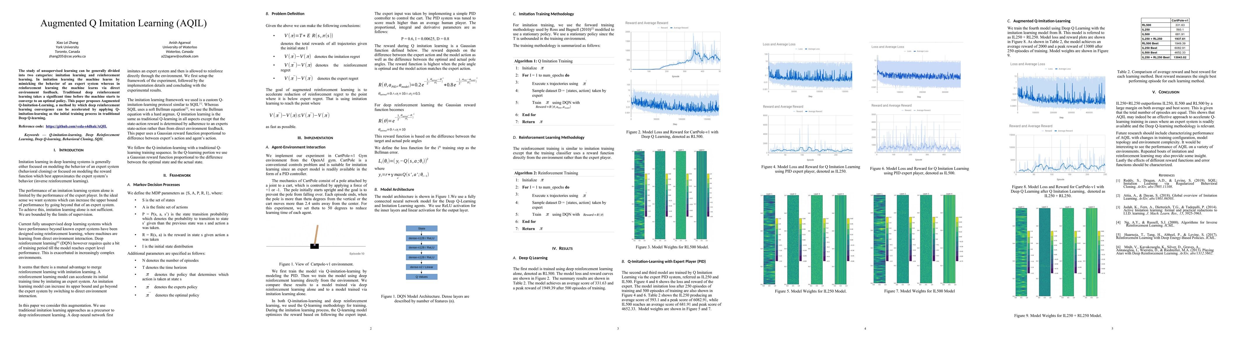 Summary: This paper introduces Augmented Q-Imitation Learning (AQIL), a method that accelerates the convergence of traditional Deep Q-learning by using Q-imitation learning as an initial training phase, thus bridging the gap in unsupervised learning between imitation and reinforcement learning.