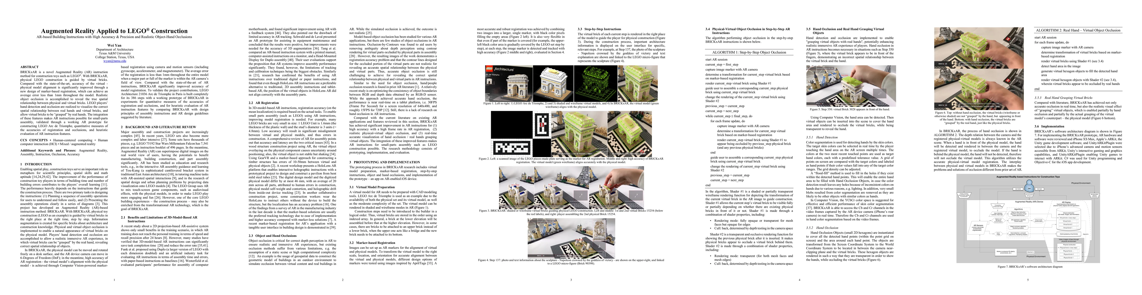 BRICKxAR enhances LEGO construction with AR guidance, achieving high accuracy through improved marker-based registration and realistic object occlusions, validated by a prototype and quantitative accuracy measures. The system also detects and occludes players' hands to visualize correct spatial relationships, enabling precise small-parts assembly.