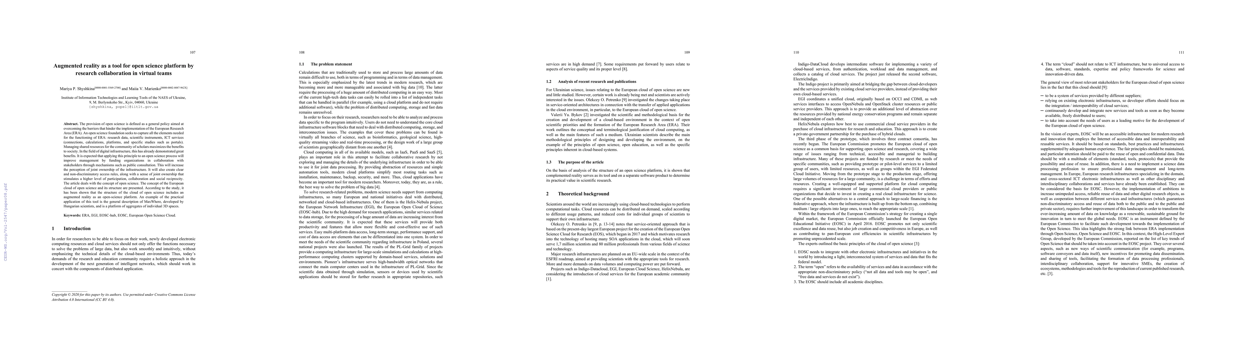 The provision of open science is defined as a general policy aimed at overcoming the barriers that hinder the implementation of the European Research Area (ERA). An open science foundation seeks to capture all the elements needed for the functioning of ERA: research data, scientific instruments, ICT services (connections, calculations, platforms, and specific studies such as portals). Managing shared resources for the community of scholars maximizes the benefits to society. In the field of digital infrastructure, this has already demonstrated great benefits. It is expected that applying this principle to an open science process will improve management by funding organizations in collaboration with stakeholders through mechanisms such as public consultation. This will increase the perception of joint ownership of the infrastructure. It will also create clear and non-discriminatory access rules, along with a sense of joint ownership that stimulates a higher level of participation, collaboration and social reciprocity. The article deals with the concept of open science. The concept of the European cloud of open science and its structure are presented. According to the study, it has been shown that the structure of the cloud of open science includes an augmented reality as an open-science platform. An example of the practical application of this tool is the general description of MaxWhere, developed by Hungarian scientists, and is a platform of aggregates of individual 3D spaces.