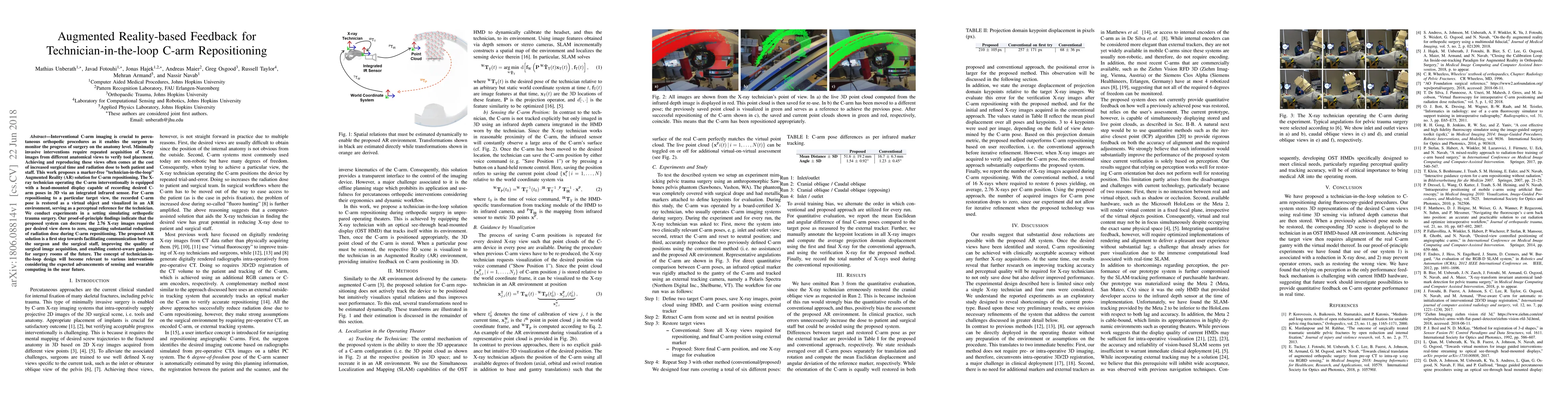 This paper proposes an Augmented Reality (AR) system for technician-assisted C-arm repositioning in orthopedic procedures, aiming to reduce surgical time and radiation exposure. The AR system enables the technician to visualize recorded C-arm poses as virtual references, significantly decreasing the number of X-ray images needed per desired view.