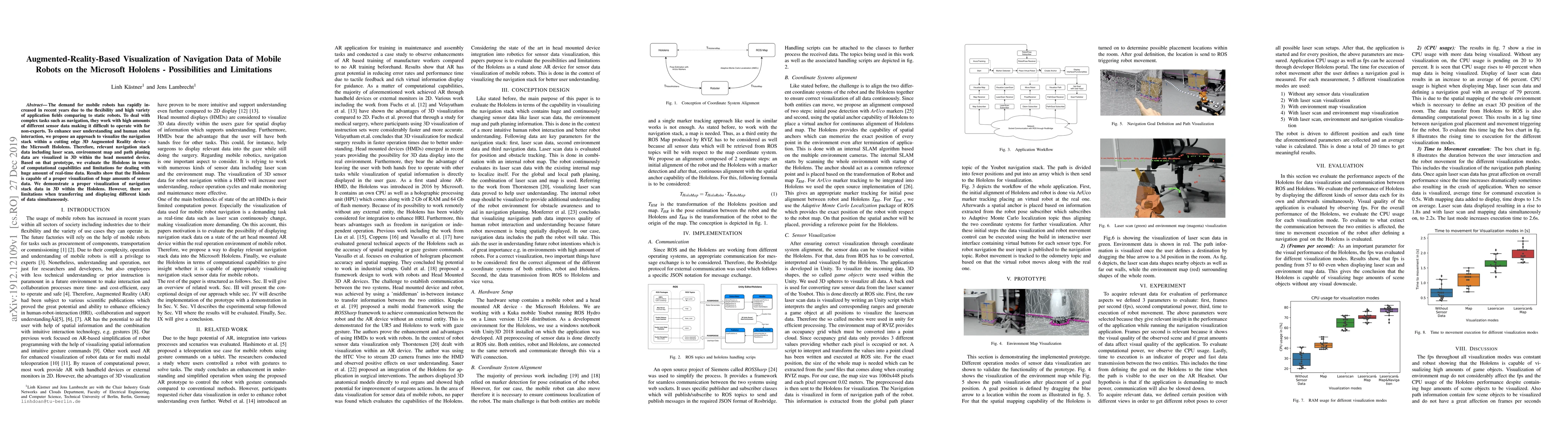 This paper proposes an augmented reality approach using the Microsoft Hololens to visualize navigation data for mobile robots, enhancing user understanding and interaction. The study finds the Hololens can effectively display large amounts of real-time sensor data but encounters limitations in simultaneously handling various types of data.