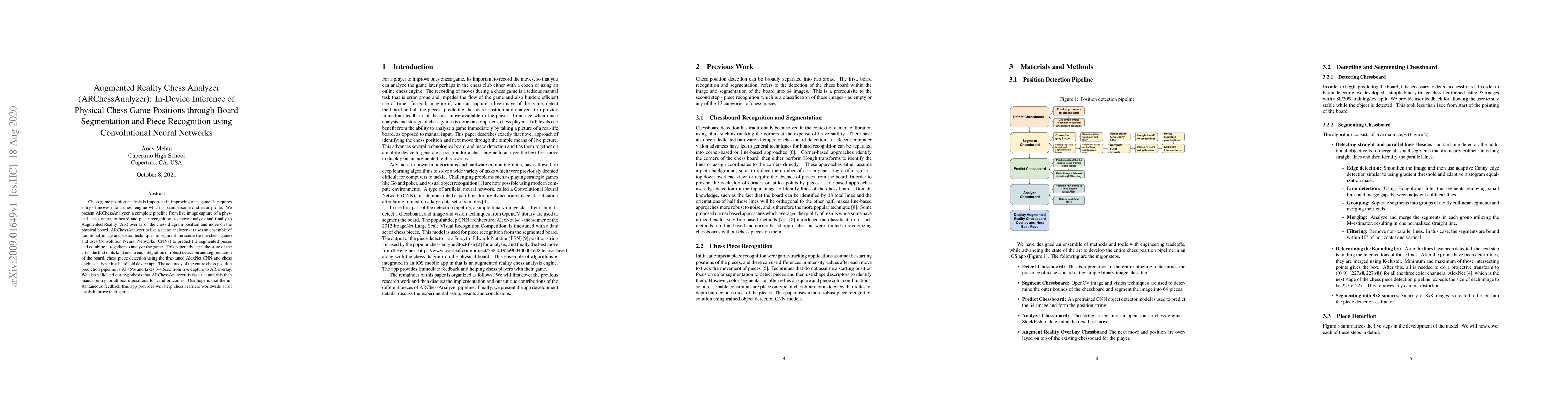 Chess game position analysis is important in improving ones game. It requires entry of moves into a chess engine which is, cumbersome and error prone. We present ARChessAnalyzer, a complete pipeline from live image capture of a physical chess game, to board and piece recognition, to move analysis and finally to Augmented Reality (AR) overlay of the chess diagram position and move on the physical board. ARChessAnalyzer is like a scene analyzer - it uses an ensemble of traditional image and vision techniques to segment the scene (ie the chess game) and uses Convolution Neural Networks (CNNs) to predict the segmented pieces and combine it together to analyze the game. This paper advances the state of the art in the first of its kind end to end integration of robust detection and segmentation of the board, chess piece detection using the fine-tuned AlexNet CNN and chess engine analyzer in a handheld device app. The accuracy of the entire chess position prediction pipeline is 93.45\% and takes 3-4.5sec from live capture to AR overlay. We also validated our hypothesis that ARChessAnalyzer, is faster at analysis than manual entry for all board positions for valid outcomes. Our hope is that the instantaneous feedback this app provides will help chess learners worldwide at all levels improve their game.