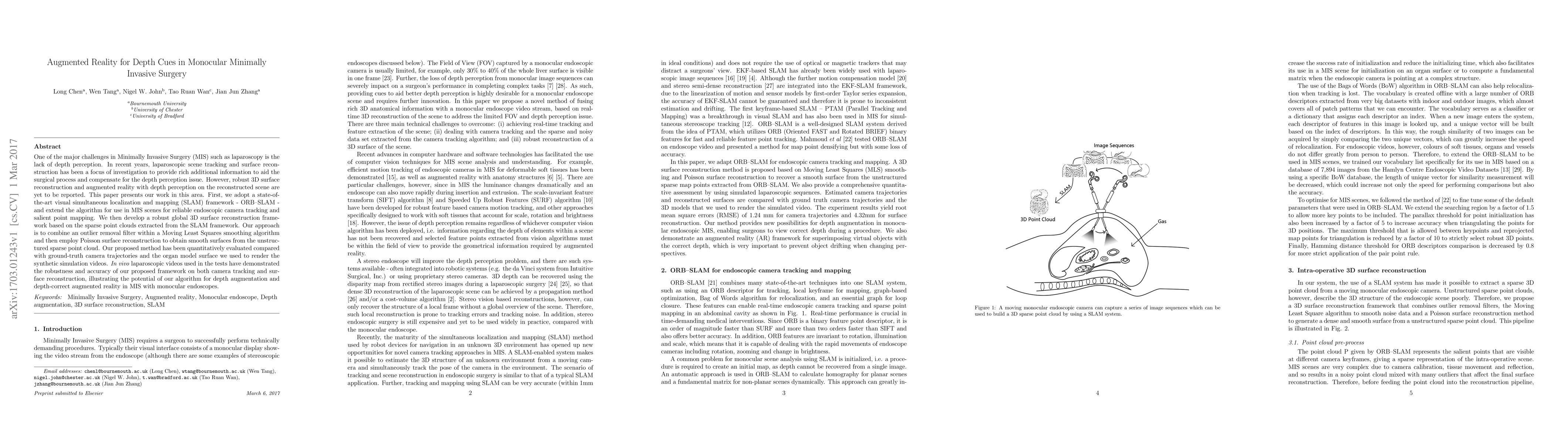 This paper proposes an augmented reality framework to enhance depth perception in monocular minimally invasive surgery (MIS) using a SLAM-based endoscopic camera tracking and a robust 3D surface reconstruction method. The results show accurate camera tracking and surface reconstruction, demonstrating potential for depth-corrected augmented reality in MIS.