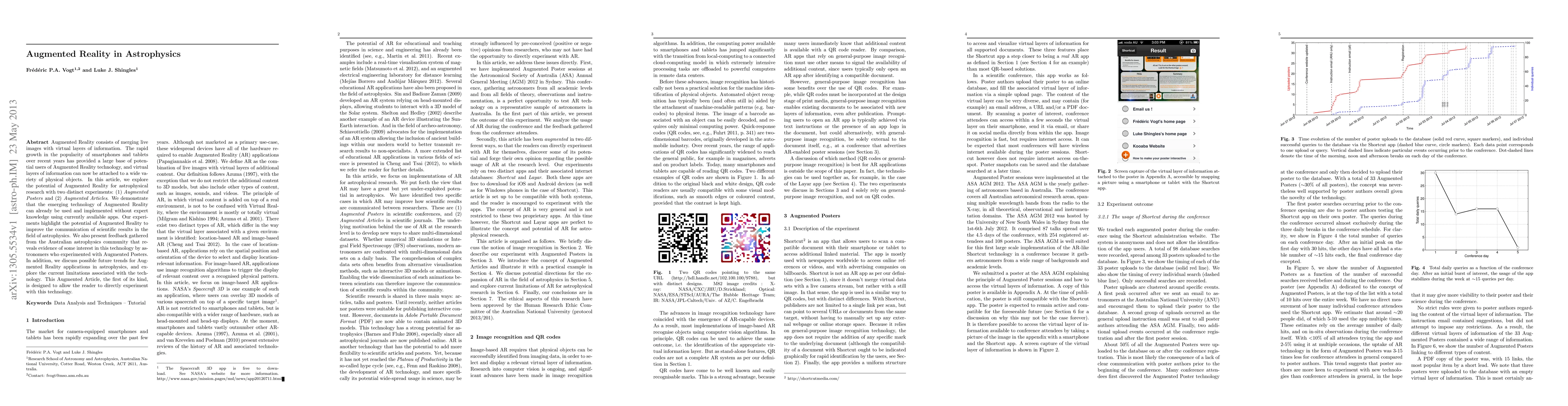 Augmented Reality consists of merging live images with virtual layers of information. The rapid growth in the popularity of smartphones and tablets over recent years has provided a large base of potential users of Augmented Reality technology, and virtual layers of information can now be attached to a wide variety of physical objects. In this article, we explore the potential of Augmented Reality for astrophysical research with two distinct experiments: (1) Augmented Posters and (2) Augmented Articles. We demonstrate that the emerging technology of Augmented Reality can already be used and implemented without expert knowledge using currently available apps. Our experiments highlight the potential of Augmented Reality to improve the communication of scientific results in the field of astrophysics. We also present feedback gathered from the Australian astrophysics community that reveals evidence of some interest in this technology by astronomers who experimented with Augmented Posters. In addition, we discuss possible future trends for Augmented Reality applications in astrophysics, and explore the current limitations associated with the technology. This Augmented Article, the first of its kind, is designed to allow the reader to directly experiment with this technology.