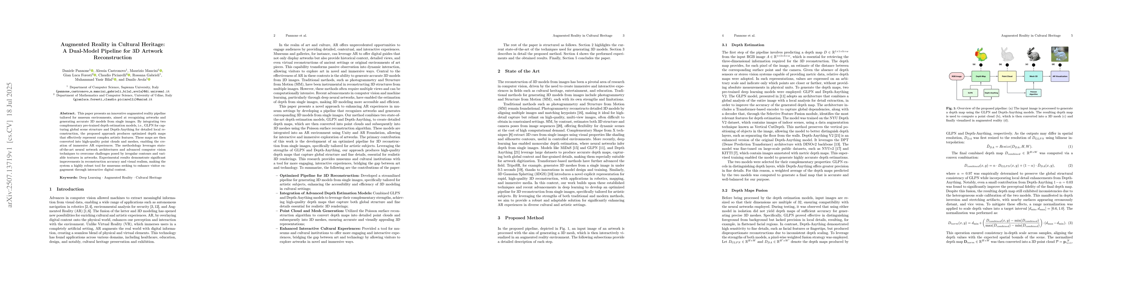 This paper presents an innovative augmented reality pipeline tailored for museum environments, aimed at recognizing artworks and generating accurate 3D models from single images. By integrating two complementary pre-trained depth estimation models, i.e., GLPN for capturing global scene structure and Depth-Anything for detailed local reconstruction, the proposed approach produces optimized depth maps that effectively represent complex artistic features. These maps are then converted into high-quality point clouds and meshes, enabling the creation of immersive AR experiences. The methodology leverages state-of-the-art neural network architectures and advanced computer vision techniques to overcome challenges posed by irregular contours and variable textures in artworks. Experimental results demonstrate significant improvements in reconstruction accuracy and visual realism, making the system a highly robust tool for museums seeking to enhance visitor engagement through interactive digital content.