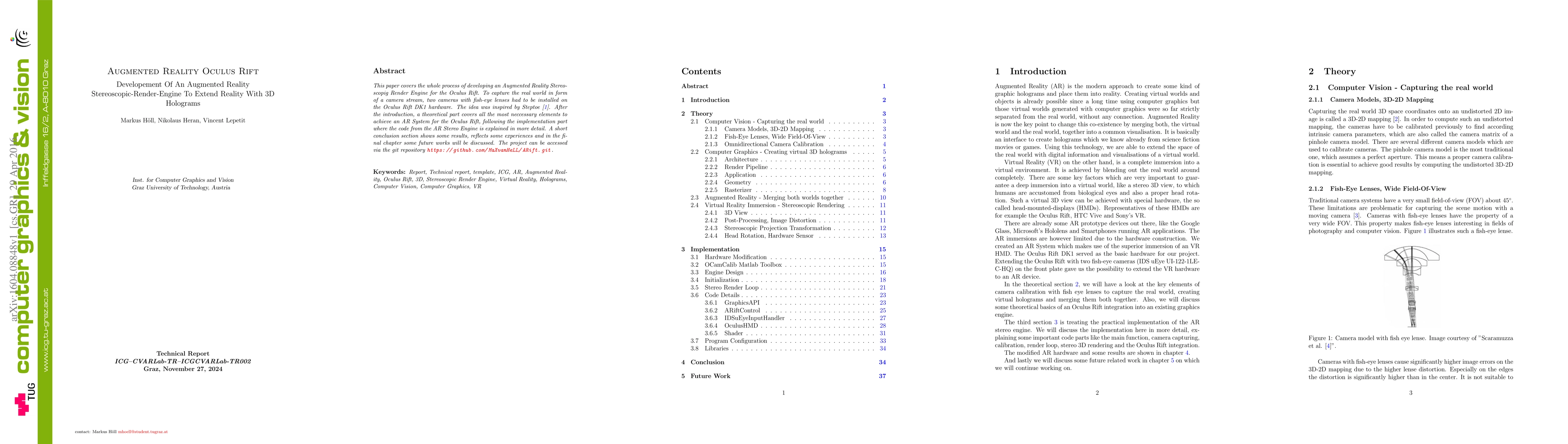 This paper details the development of an Augmented Reality Stereoscopic Render Engine for the Oculus Rift, utilizing two fish-eye lens cameras to capture real-world imagery. The project, inspired by Steptoe, includes theoretical and implementation sections, followed by results and future work discussions.
