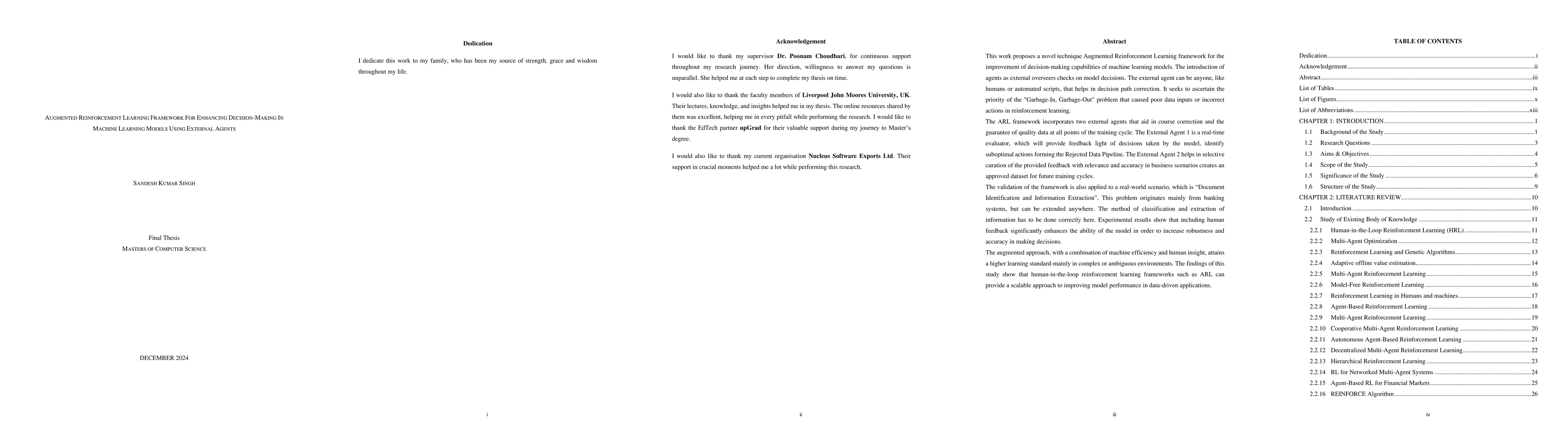 This work proposes a novel technique Augmented Reinforcement Learning framework for the improvement of decision-making capabilities of machine learning models. The introduction of agents as external overseers checks on model decisions. The external agent can be anyone, like humans or automated scripts, that helps in decision path correction. It seeks to ascertain the priority of the "Garbage-In, Garbage-Out" problem that caused poor data inputs or incorrect actions in reinforcement learning. The ARL framework incorporates two external agents that aid in course correction and the guarantee of quality data at all points of the training cycle. The External Agent 1 is a real-time evaluator, which will provide feedback light of decisions taken by the model, identify suboptimal actions forming the Rejected Data Pipeline. The External Agent 2 helps in selective curation of the provided feedback with relevance and accuracy in business scenarios creates an approved dataset for future training cycles. The validation of the framework is also applied to a real-world scenario, which is "Document Identification and Information Extraction". This problem originates mainly from banking systems, but can be extended anywhere. The method of classification and extraction of information has to be done correctly here. Experimental results show that including human feedback significantly enhances the ability of the model in order to increase robustness and accuracy in making decisions. The augmented approach, with a combination of machine efficiency and human insight, attains a higher learning standard-mainly in complex or ambiguous environments. The findings of this study show that human-in-the-loop reinforcement learning frameworks such as ARL can provide a scalable approach to improving model performance in data-driven applications.