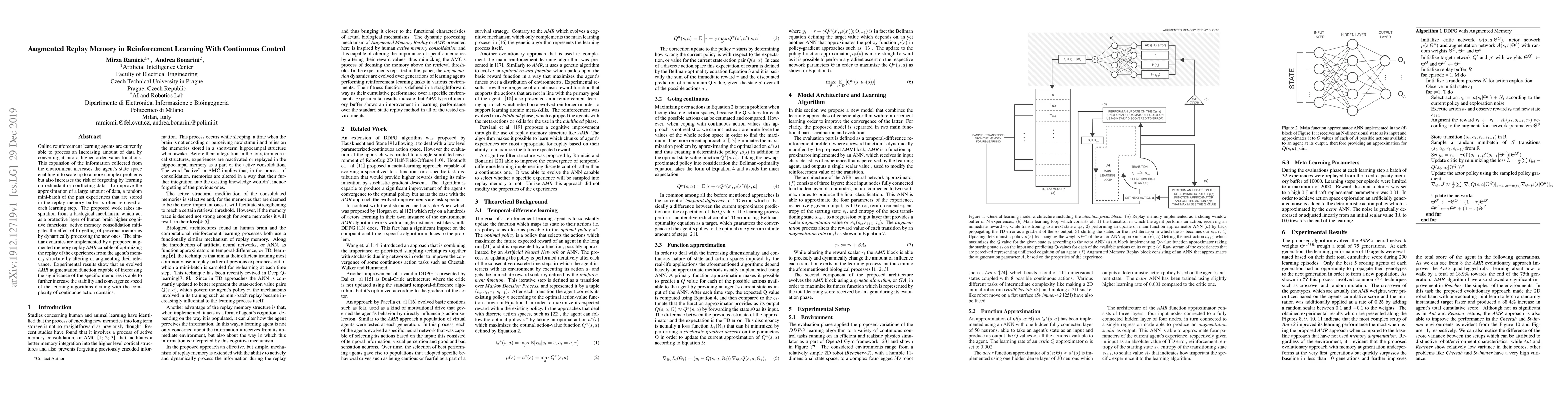 Online reinforcement learning agents are currently able to process an increasing amount of data by converting it into a higher order value functions. This expansion of the information collected from the environment increases the agent's state space enabling it to scale up to a more complex problems but also increases the risk of forgetting by learning on redundant or conflicting data. To improve the approximation of a large amount of data, a random mini-batch of the past experiences that are stored in the replay memory buffer is often replayed at each learning step. The proposed work takes inspiration from a biological mechanism which act as a protective layer of human brain higher cognitive functions: active memory consolidation mitigates the effect of forgetting of previous memories by dynamically processing the new ones. The similar dynamics are implemented by a proposed augmented memory replay AMR capable of optimizing the replay of the experiences from the agent's memory structure by altering or augmenting their relevance. Experimental results show that an evolved AMR augmentation function capable of increasing the significance of the specific memories is able to further increase the stability and convergence speed of the learning algorithms dealing with the complexity of continuous action domains.