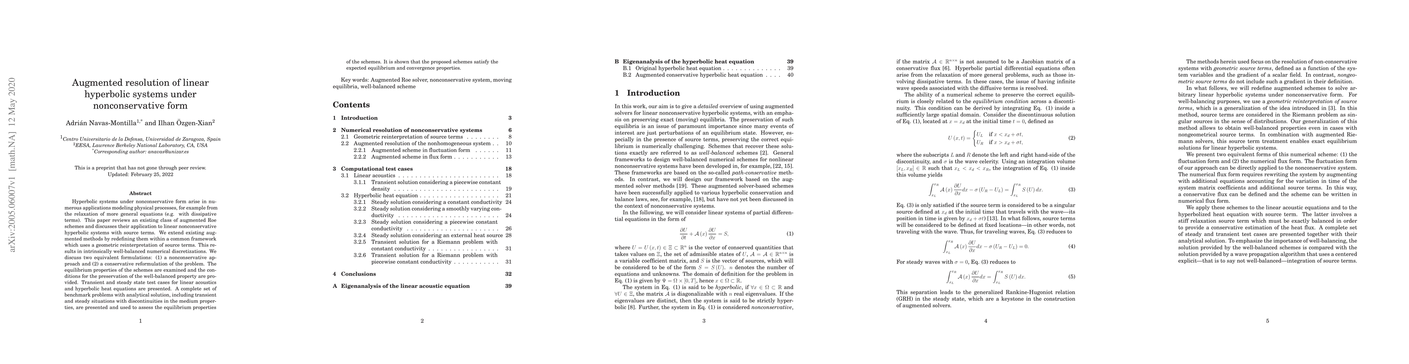 Hyperbolic systems under nonconservative form arise in numerous applications modeling physical processes, for example from the relaxation of more general equations (e.g. with dissipative terms). This paper reviews an existing class of augmented Roe schemes and discusses their application to linear nonconservative hyperbolic systems with source terms. We extend existing augmented methods by redefining them within a common framework which uses a geometric reinterpretation of source terms. This results in intrinsically well-balanced numerical discretizations. We discuss two equivalent formulations: (1) a nonconservative approach and (2) a conservative reformulation of the problem. The equilibrium properties of the schemes are examined and the conditions for the preservation of the well-balanced property are provided. Transient and steady state test cases for linear acoustics and hyperbolic heat equations are presented. A complete set of benchmark problems with analytical solution, including transient and steady situations with discontinuities in the medium properties, are presented and used to assess the equilibrium properties of the schemes. It is shown that the proposed schemes satisfy the expected equilibrium and convergence properties.