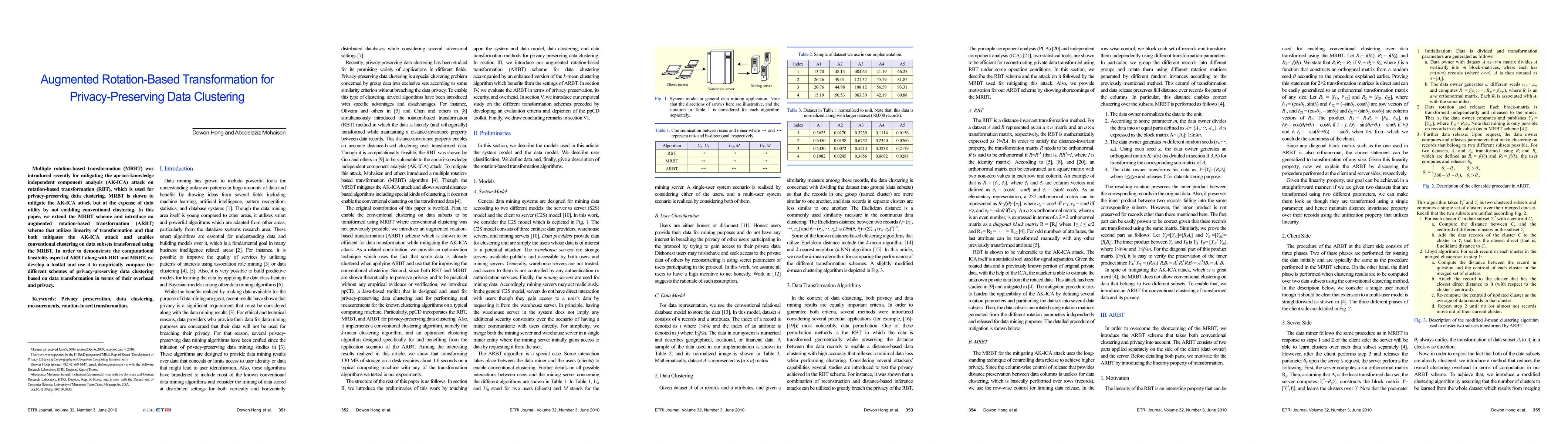 This paper introduces an augmented rotation-based transformation (ARBT) scheme that enhances multiple rotation-based transformation (MRBT) to both mitigate AK-ICA attacks and allow conventional clustering on transformed data subsets, while developing a toolkit for empirical comparison of ARBT, MRBT, and RBT in terms of overhead and privacy.
