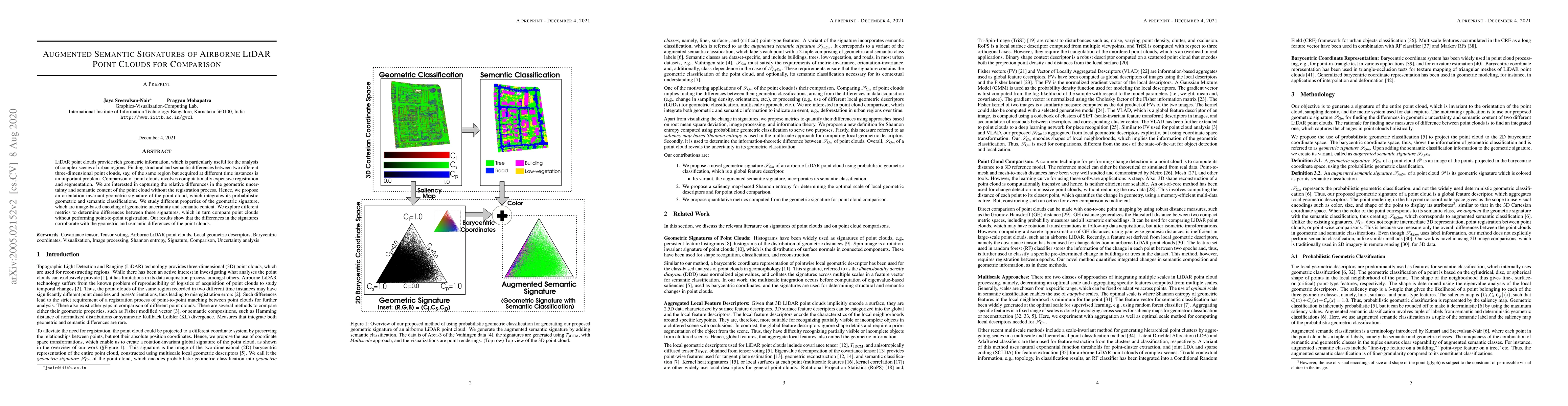 LiDAR point clouds provide rich geometric information, which is particularly useful for the analysis of complex scenes of urban regions. Finding structural and semantic differences between two different three-dimensional point clouds, say, of the same region but acquired at different time instances is an important problem. A comparison of point clouds involves computationally expensive registration and segmentation. We are interested in capturing the relative differences in the geometric uncertainty and semantic content of the point cloud without the registration process. Hence, we propose an orientation-invariant geometric signature of the point cloud, which integrates its probabilistic geometric and semantic classifications. We study different properties of the geometric signature, which are an image-based encoding of geometric uncertainty and semantic content. We explore different metrics to determine differences between these signatures, which in turn compare point clouds without performing point-to-point registration. Our results show that the differences in the signatures corroborate with the geometric and semantic differences of the point clouds.