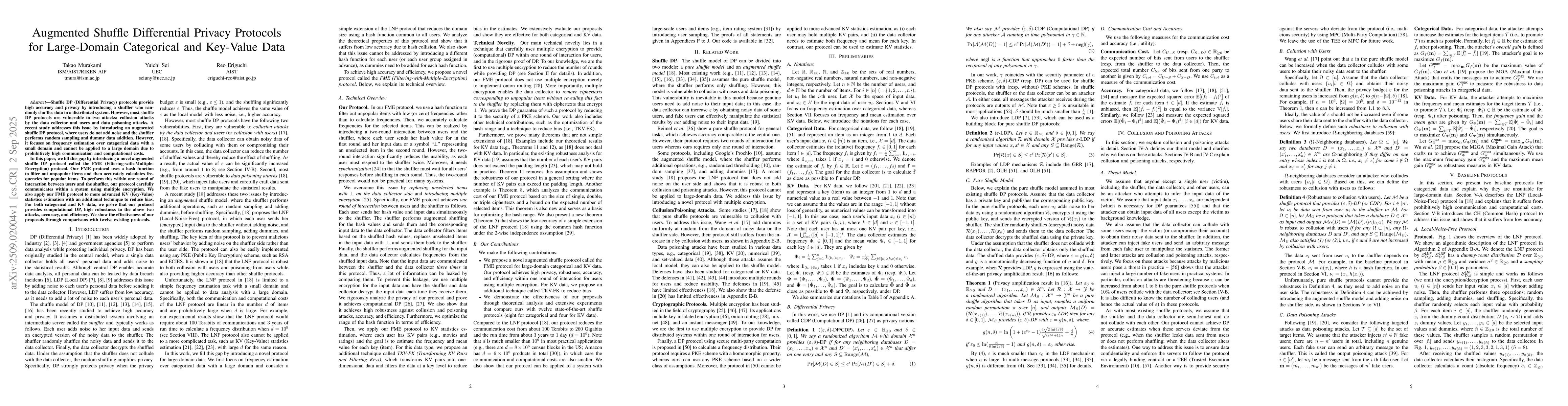 Shuffle DP (Differential Privacy) protocols provide high accuracy and privacy by introducing a shuffler who randomly shuffles data in a distributed system. However, most shuffle DP protocols are vulnerable to two attacks: collusion attacks by the data collector and users and data poisoning attacks. A recent study addresses this issue by introducing an augmented shuffle DP protocol, where users do not add noise and the shuffler performs random sampling and dummy data addition. However, it focuses on frequency estimation over categorical data with a small domain and cannot be applied to a large domain due to prohibitively high communication and computational costs. In this paper, we fill this gap by introducing a novel augmented shuffle DP protocol called the FME (Filtering-with-Multiple-Encryption) protocol. Our FME protocol uses a hash function to filter out unpopular items and then accurately calculates frequencies for popular items. To perform this within one round of interaction between users and the shuffler, our protocol carefully communicates within a system using multiple encryption. We also apply our FME protocol to more advanced KV (Key-Value) statistics estimation with an additional technique to reduce bias. For both categorical and KV data, we prove that our protocol provides computational DP, high robustness to the above two attacks, accuracy, and efficiency. We show the effectiveness of our proposals through comparisons with twelve existing protocols.