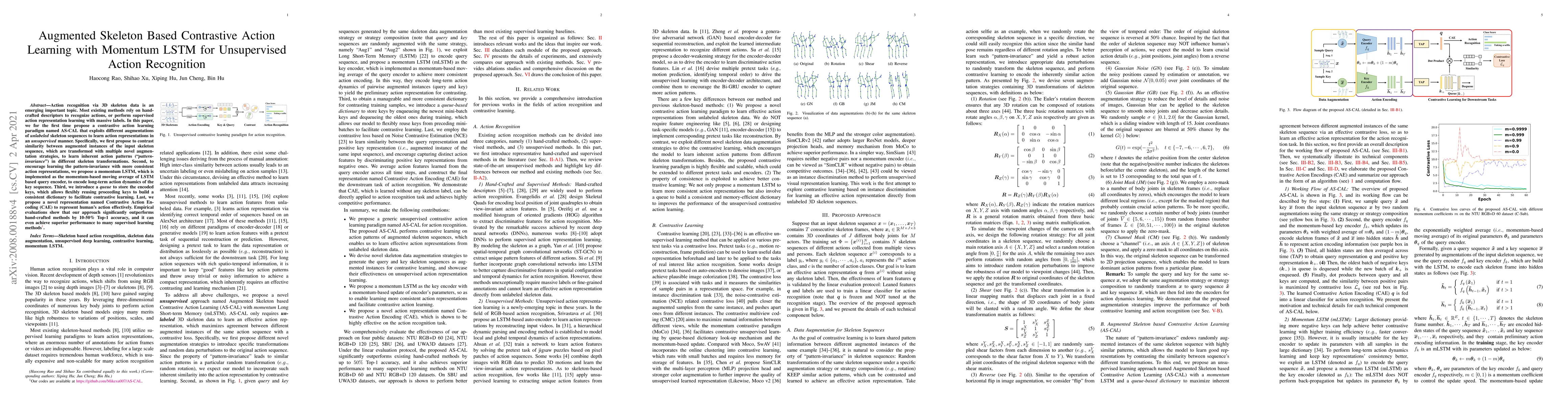 This paper introduces an unsupervised action recognition method named AS-CAL that leverages augmented skeleton data to learn action representations through contrastive learning. The approach employs a momentum LSTM to encode long-term action dynamics and a queue for consistent dictionary building, achieving significant improvements over both hand-crafted and supervised methods.