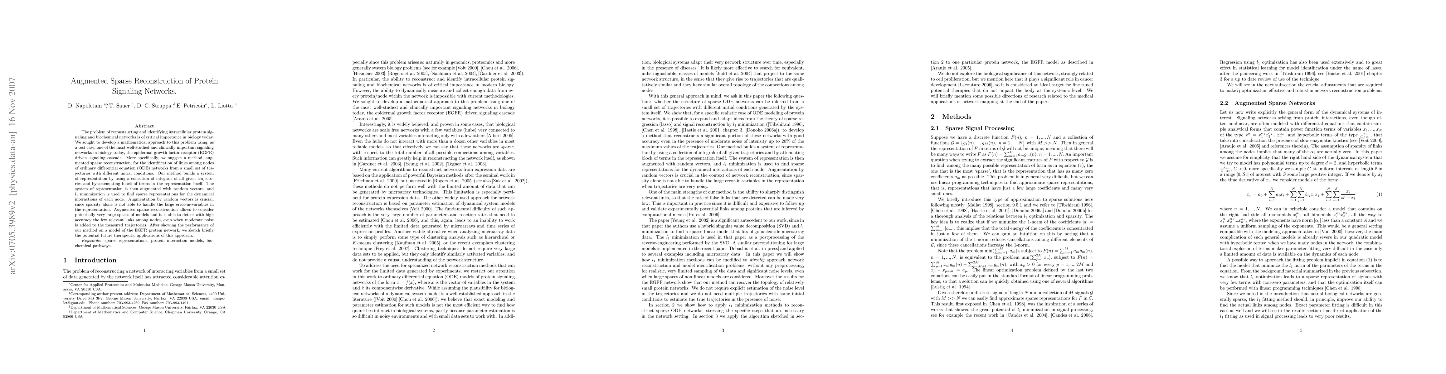 This paper proposes an augmented sparse reconstruction method to identify links in protein signaling networks, specifically focusing on the EGFR signaling cascade. The method uses a combination of trajectory integrals and random vector augmentation to achieve accurate sparse representations, even with moderate noise.