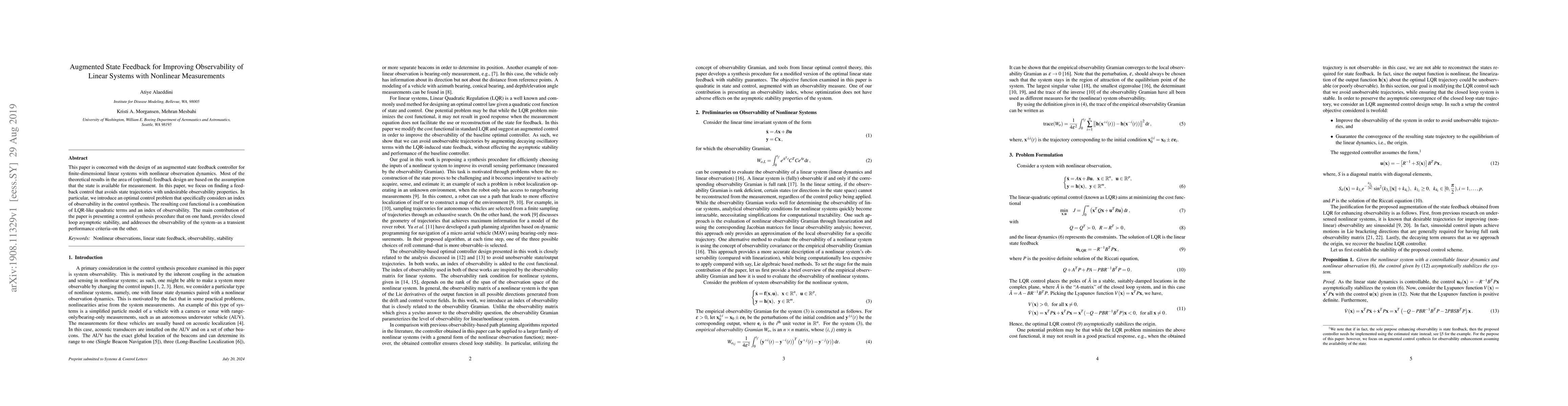 This paper is concerned with the design of an augmented state feedback controller for finite-dimensional linear systems with nonlinear observation dynamics. Most of the theoretical results in the area of (optimal) feedback design are based on the assumption that the state is available for measurement. In this paper, we focus on finding a feedback control that avoids state trajectories with undesirable observability properties. In particular, we introduce an optimal control problem that specifically considers an index of observability in the control synthesis. The resulting cost functional is a combination of LQR-like quadratic terms and an index of observability. The main contribution of the paper is presenting a control synthesis procedure that on one hand, provides closed loop asymptotic stability, and addresses the observability of the system--as a transient performance criteria--on the other.