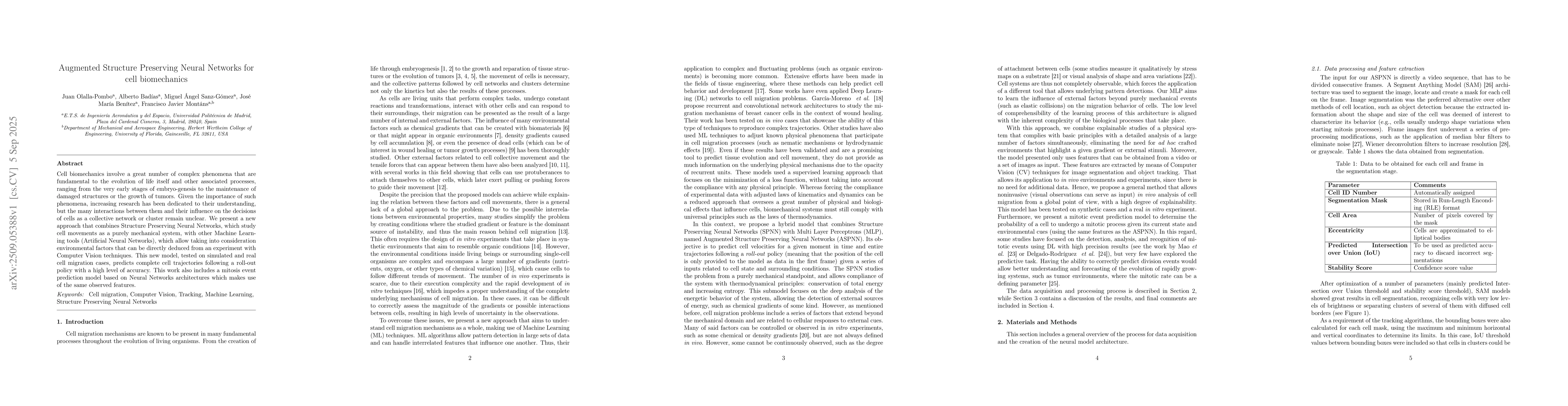 Cell biomechanics involve a great number of complex phenomena that are fundamental to the evolution of life itself and other associated processes, ranging from the very early stages of embryo-genesis to the maintenance of damaged structures or the growth of tumors. Given the importance of such phenomena, increasing research has been dedicated to their understanding, but the many interactions between them and their influence on the decisions of cells as a collective network or cluster remain unclear. We present a new approach that combines Structure Preserving Neural Networks, which study cell movements as a purely mechanical system, with other Machine Learning tools (Artificial Neural Networks), which allow taking into consideration environmental factors that can be directly deduced from an experiment with Computer Vision techniques. This new model, tested on simulated and real cell migration cases, predicts complete cell trajectories following a roll-out policy with a high level of accuracy. This work also includes a mitosis event prediction model based on Neural Networks architectures which makes use of the same observed features.
