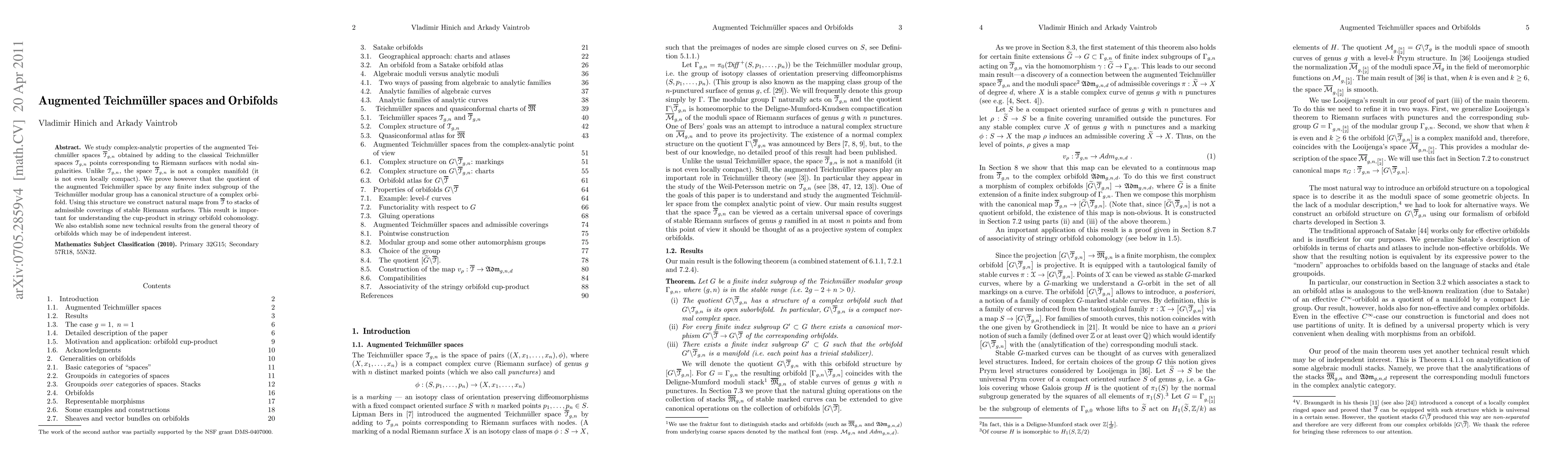 This paper investigates the complex-analytic properties of augmented Teichmüller spaces, extending classical Teichmüller spaces by including nodal Riemann surfaces. It proves that the quotient of these spaces by finite index subgroups of the Teichmüller modular group forms a complex orbifold, facilitating constructions of maps to stacks of admissible coverings and aiding in understanding stringy orbifold cohomology.