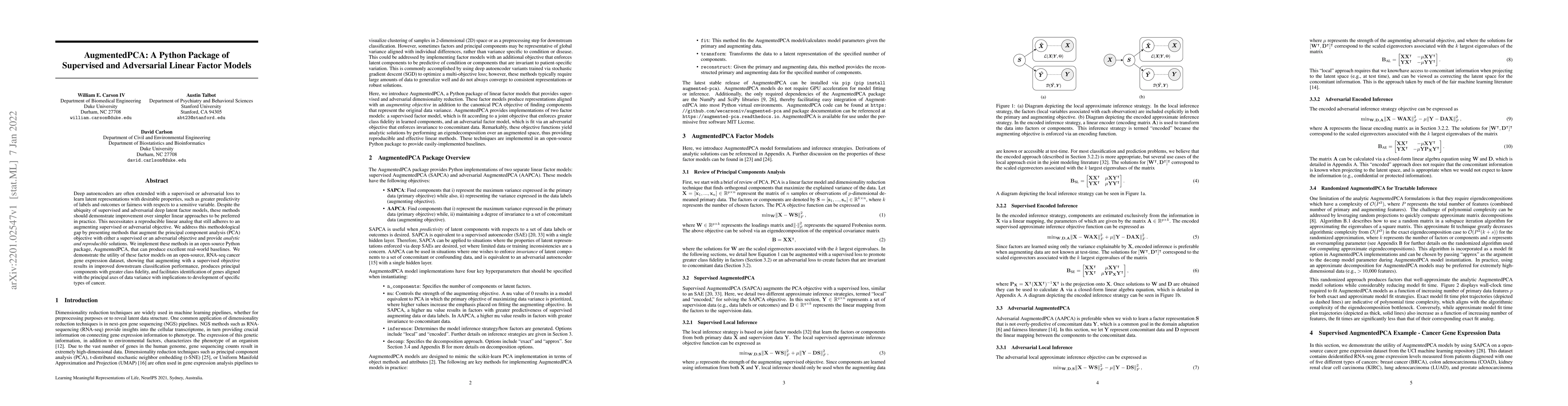 This paper introduces AugmentedPCA, a Python package that enhances Principal Component Analysis (PCA) with supervised or adversarial objectives. It provides reproducible linear solutions and demonstrates improved downstream classification performance and class fidelity of principal components on an RNA-seq cancer dataset, aiding in cancer gene expression analysis.