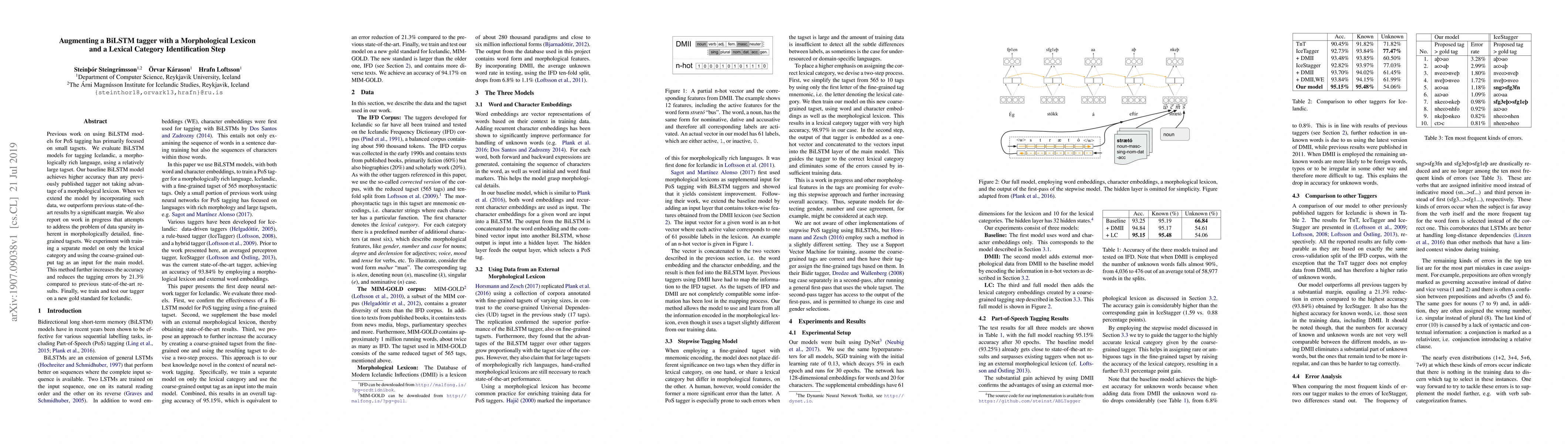 This research evaluates BiLSTM models for Part-of-Speech (PoS) tagging in Icelandic, a morphologically rich language, achieving higher accuracy with a large tagset. By incorporating a morphological lexicon and a lexical category identification step, the model significantly outperforms previous state-of-the-art results, reducing tagging errors by 21.3%.