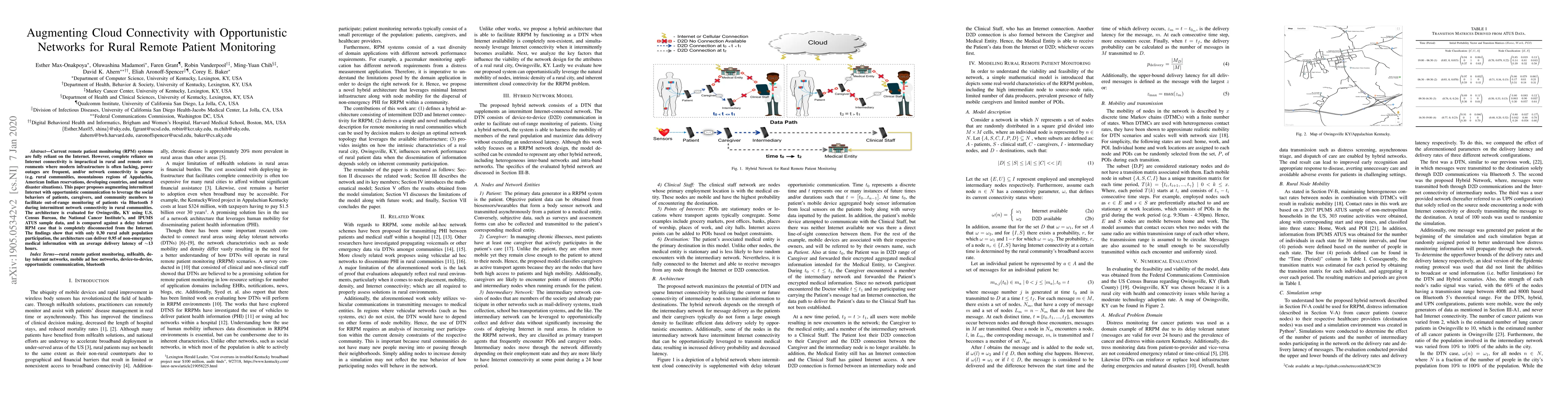 Current remote patient monitoring (RPM) systems are fully reliant on the Internet. However, complete reliance on Internet connectivity is impractical in rural and remote environments where modern infrastructure is often lacking, power outages are frequent, and/or network connectivity is sparse (e.g. rural communities, mountainous regions of Appalachia, American Indian reservations, developing countries, and natural disaster situations). This paper proposes augmenting intermittent Internet with opportunistic communication to leverage the social behaviors of patients, caregivers, and community members to facilitate out-of-range monitoring of patients via Bluetooth 5 during intermittent network connectivity in rural communities. The architecture is evaluated for Owingsville, KY using U.S. Census Bureau, the National Cancer Institute's, and IPUMS-ATUS sample data, and is compared against a delay tolerant RPM case that is completely disconnected from the Internet. The findings show that with only 0.30 rural adult population participation, the architecture can deliver 0.95 of non-emergency medical information with an average delivery latency of approximately 13 hours.