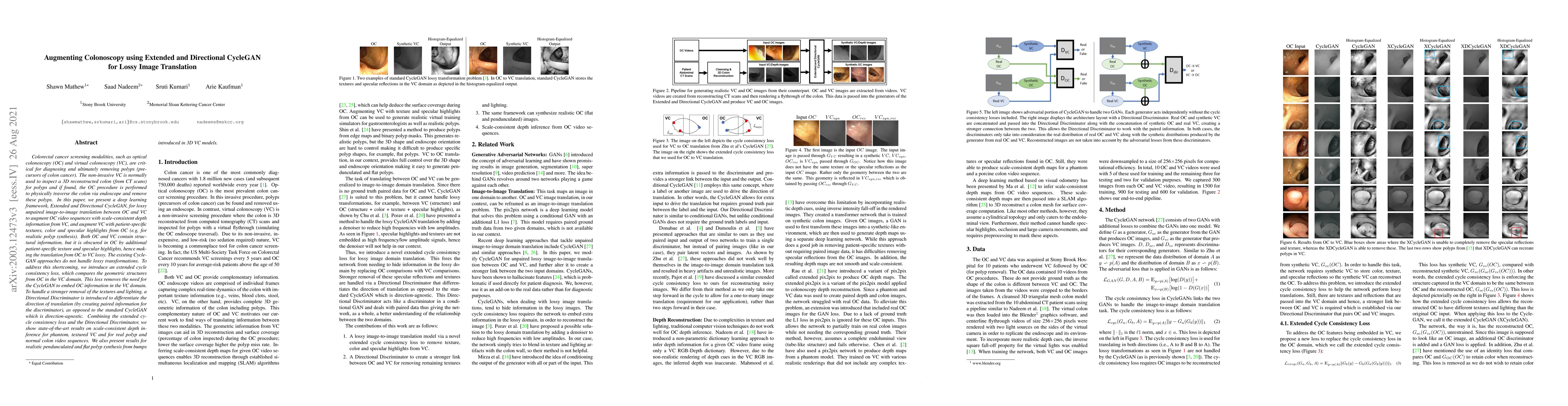 This paper proposes an Extended and Directional CycleGAN framework to translate images between optical colonoscopy (OC) and virtual colonoscopy (VC) for improved colorectal cancer screening. The method addresses lossy transformations by incorporating an extended cycle consistency loss and a Directional Discriminator, achieving state-of-the-art results in depth inference and realistic polyp synthesis.