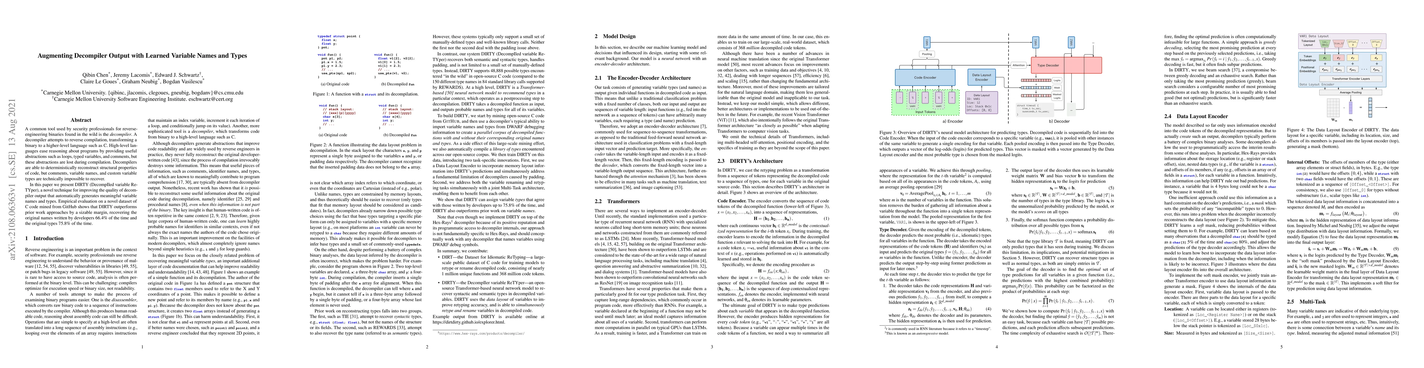 This paper introduces DIRTY, a technique to enhance decompiler output by automatically generating meaningful variable names and types, significantly improving the quality of reverse-engineered code. Empirical results show DIRTY recovers original variable names 66.4% and types 75.8% of the time, outperforming previous methods.